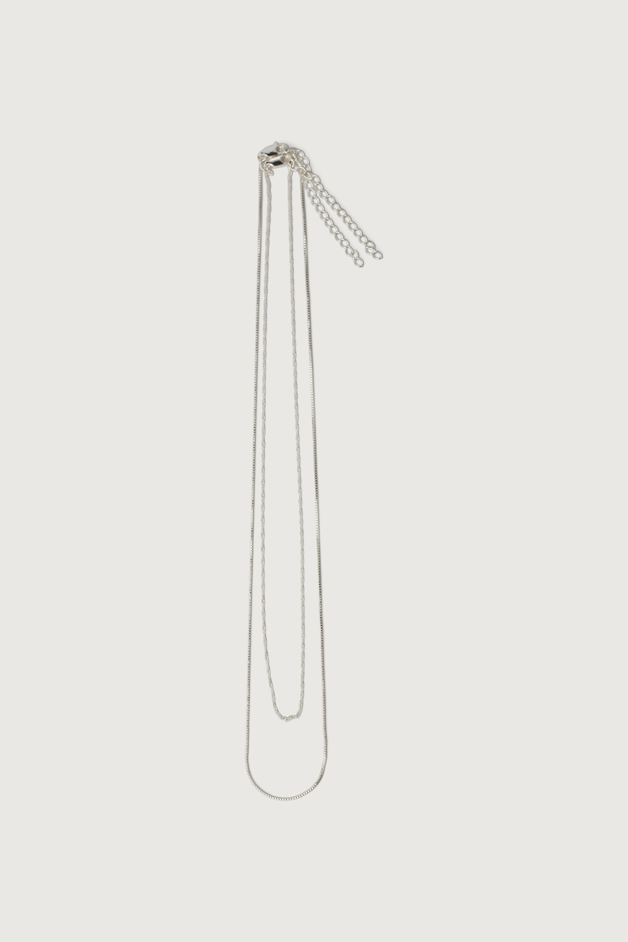 This layered necklace features two distinct chain styles—a classic box chain and an elegant Singapore chain—designed to create a polished, effortless layered look in one piece. Ideal for everyday wear or minimalist styling.