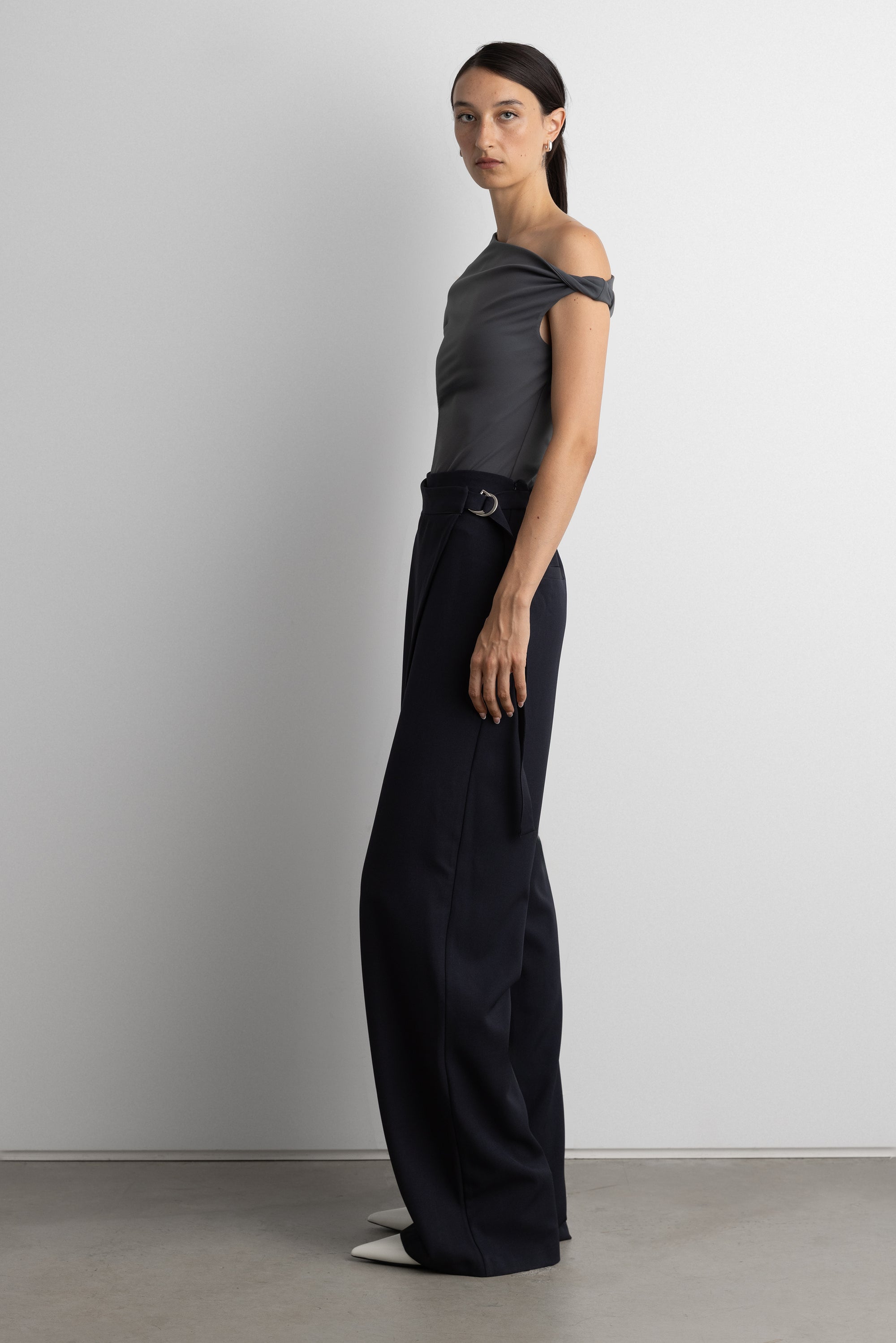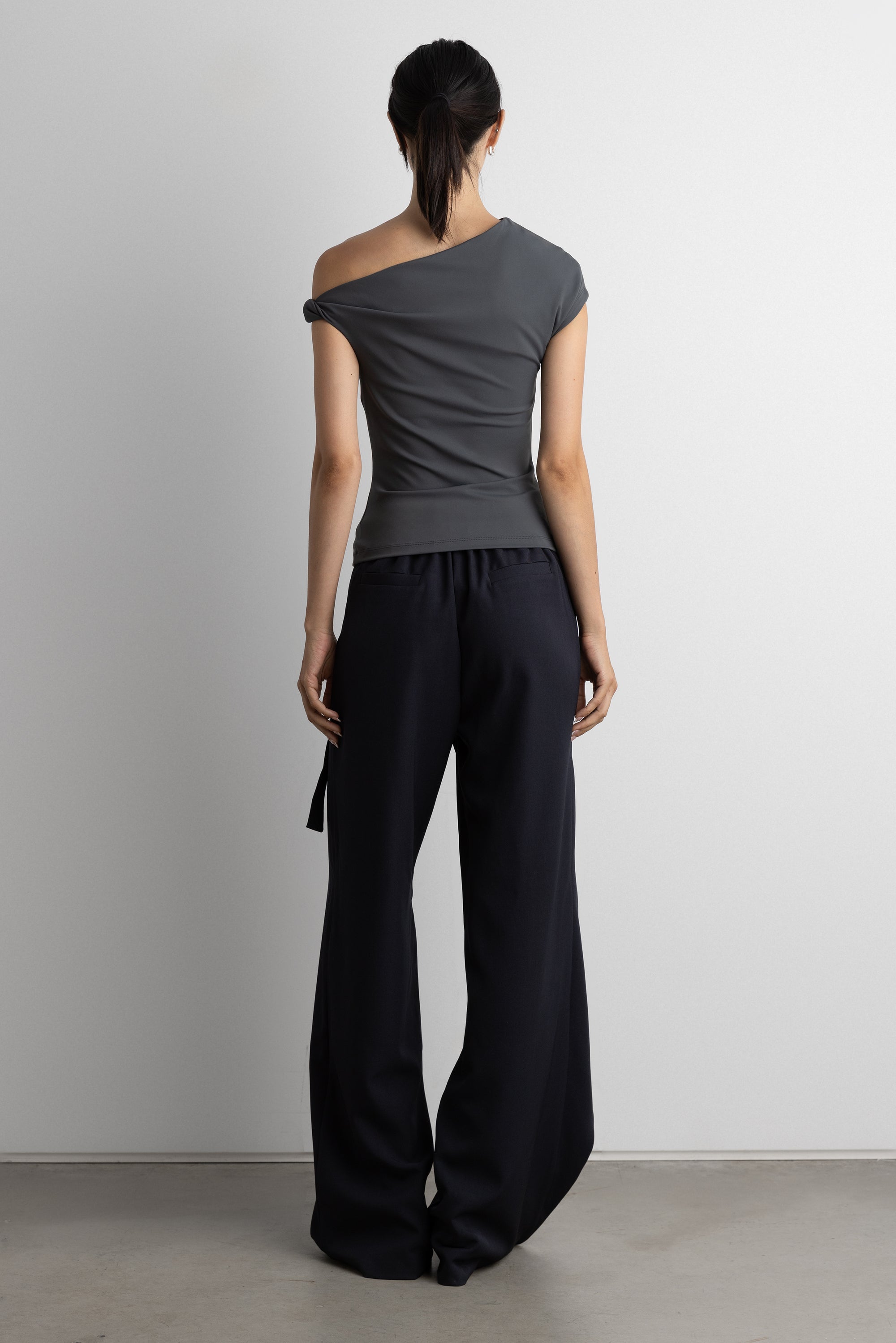 This off shoulder asymmetrical top is made from a soft feel fabric in a slim fit. It's detailed with a twist detail on one shoulder. A versatile top to wear with any bottoms from mini skirts to wide leg trousers.