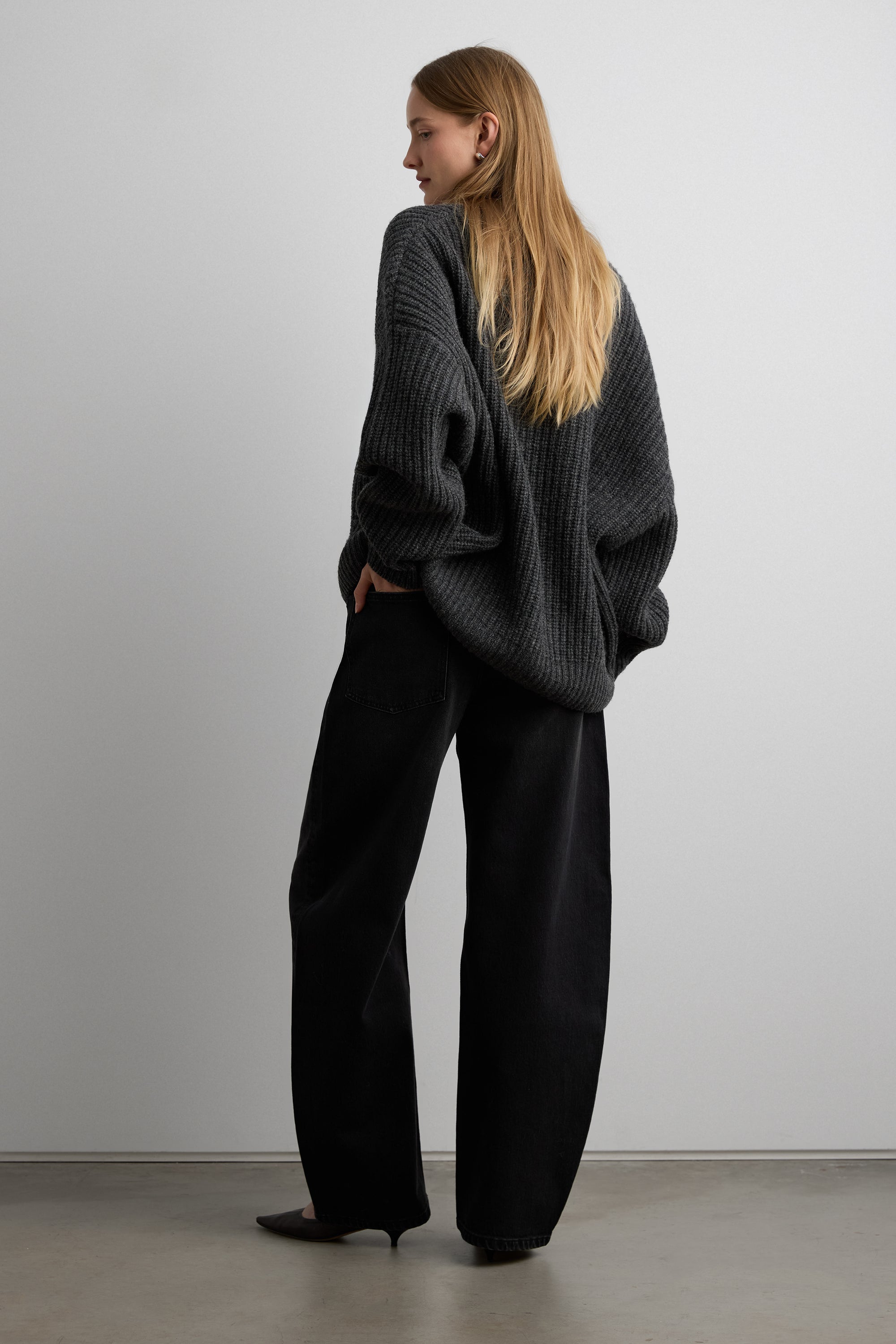 Wool rib-knit. V-neckline. Slouchy sleeves. Dropped shoulders.