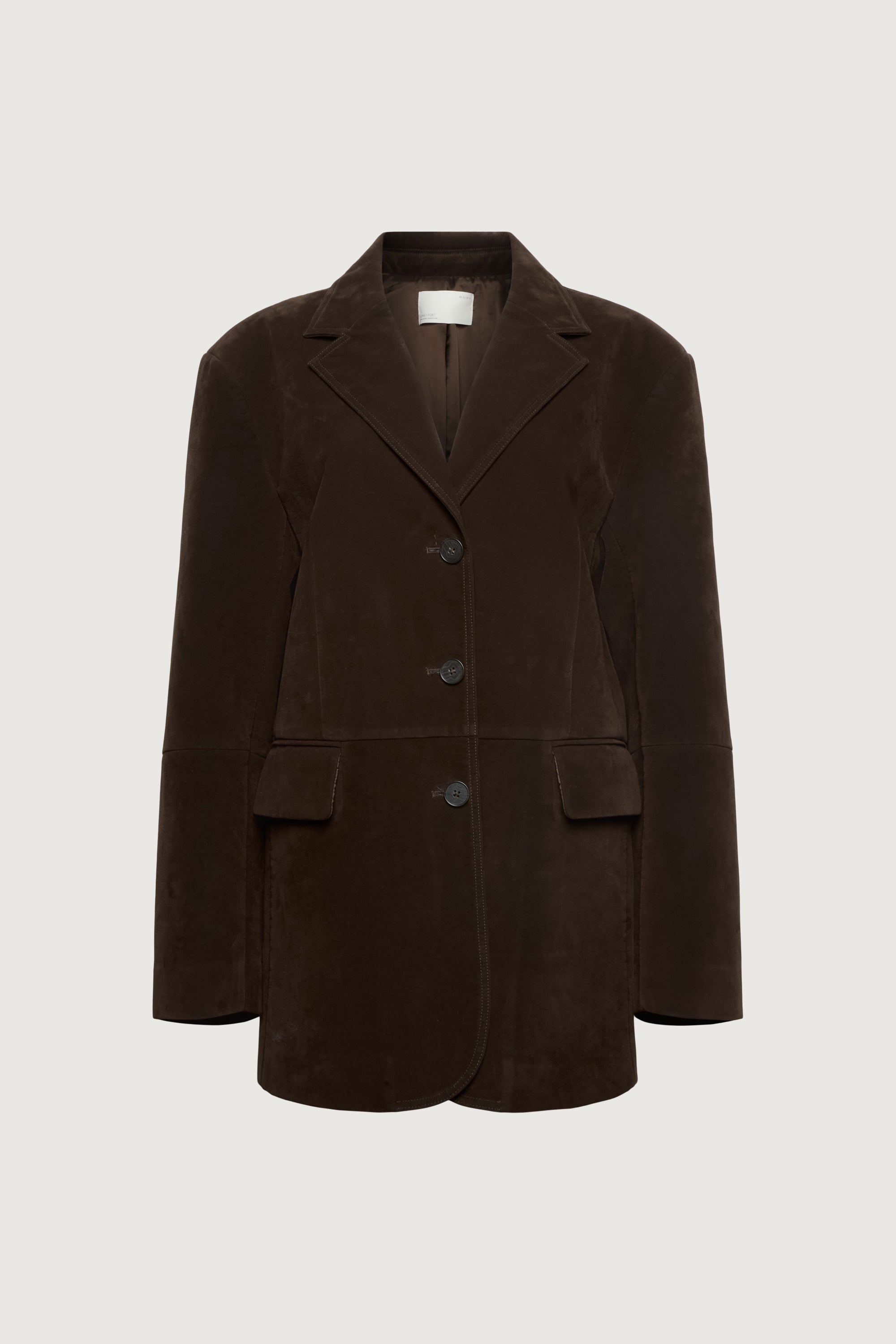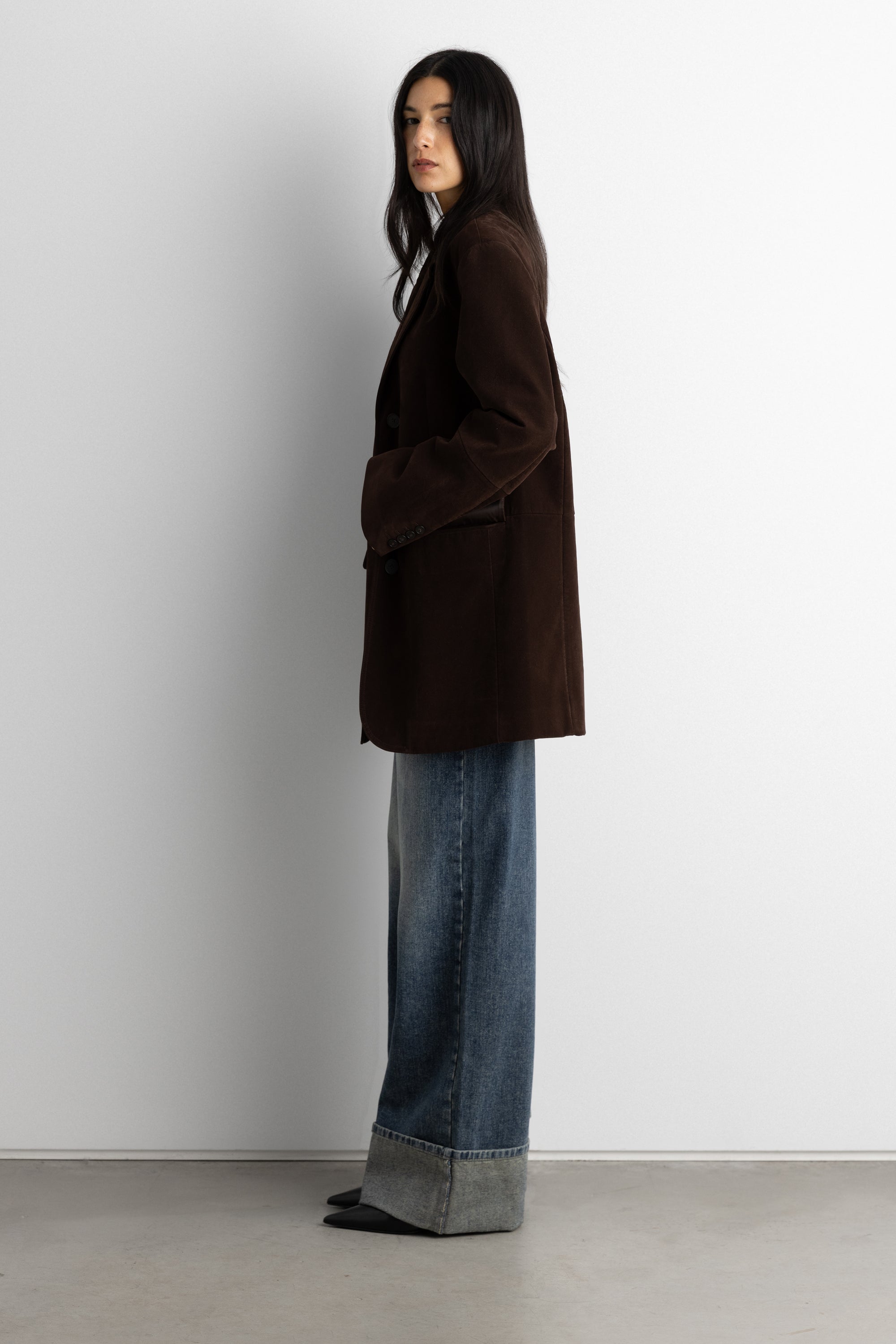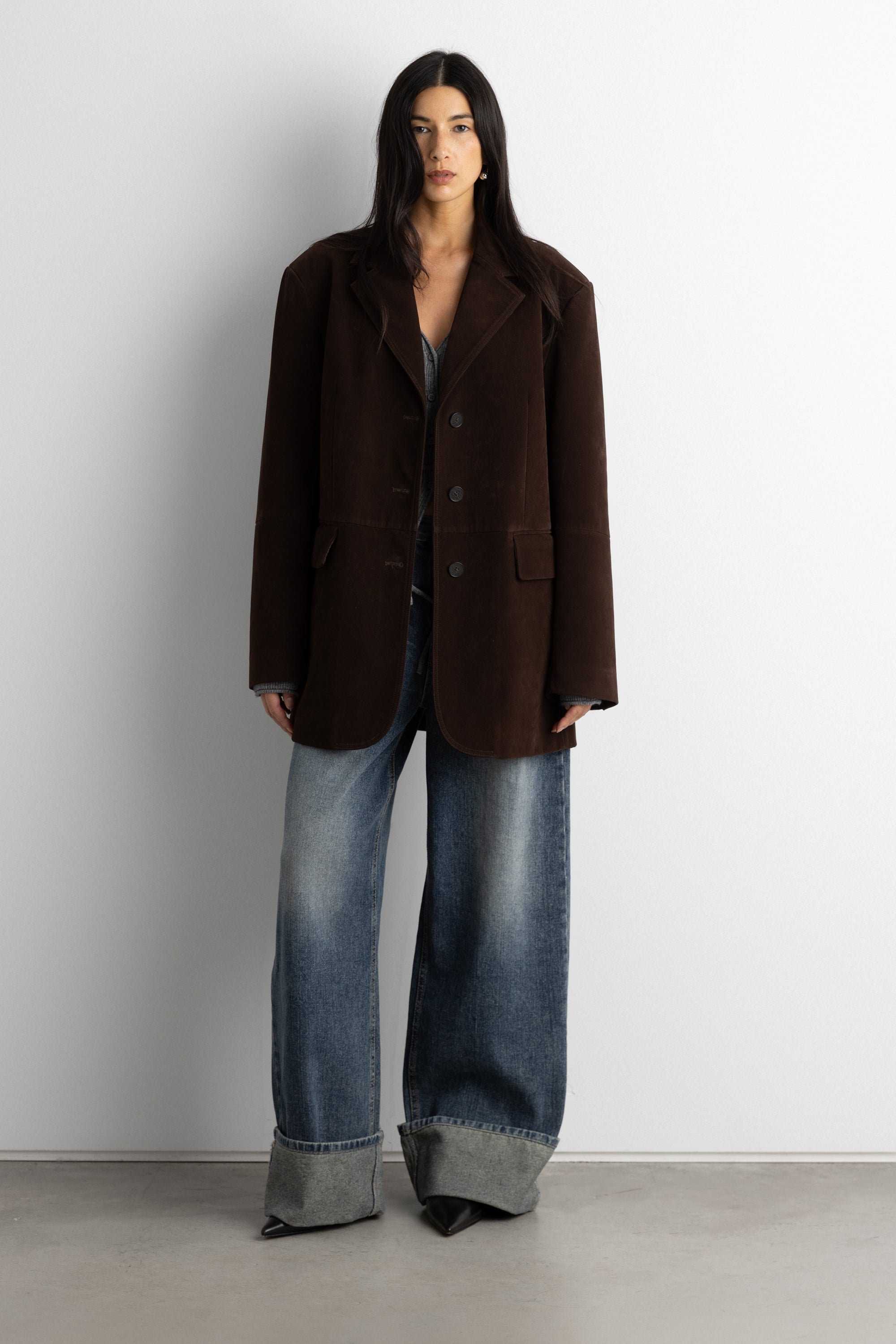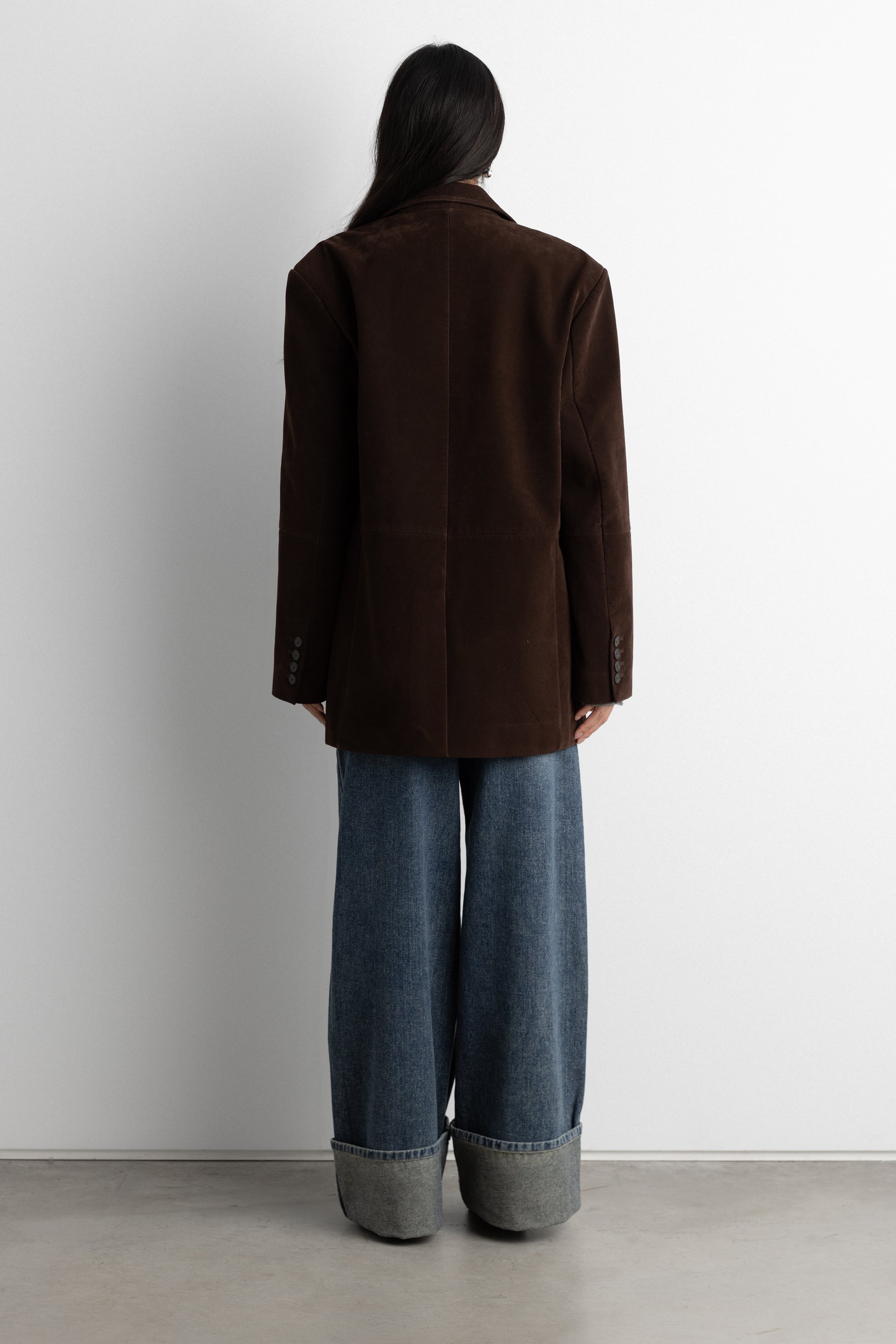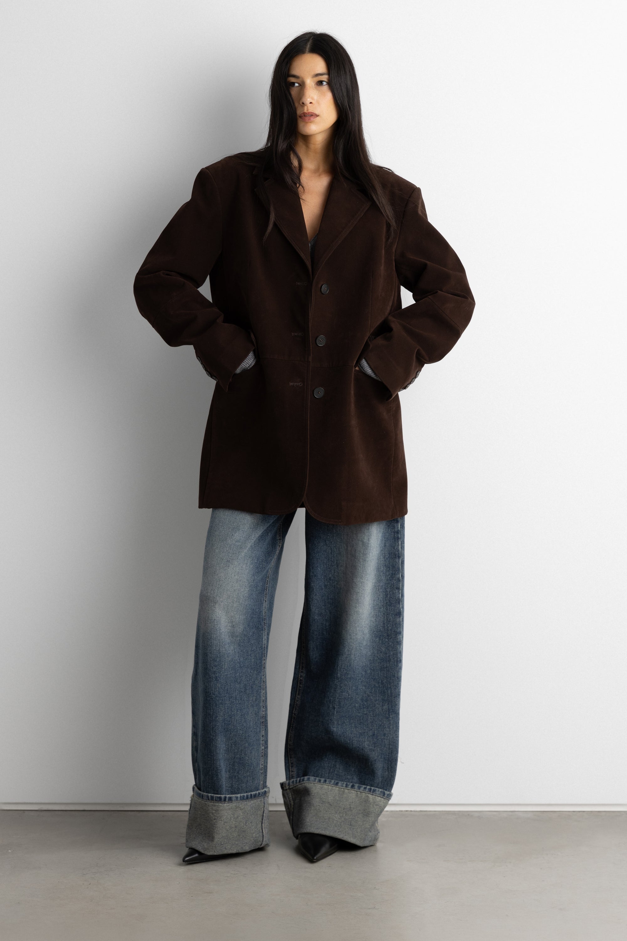 This vegan suede blazer is made in a coffee brown with a paneled design in an oversized fit. It's detailed with front button closures, front flap pocket designs and has padded shoulders. Your new go-to fall outerwear piece, style it with light wash denim or a satin skirt.