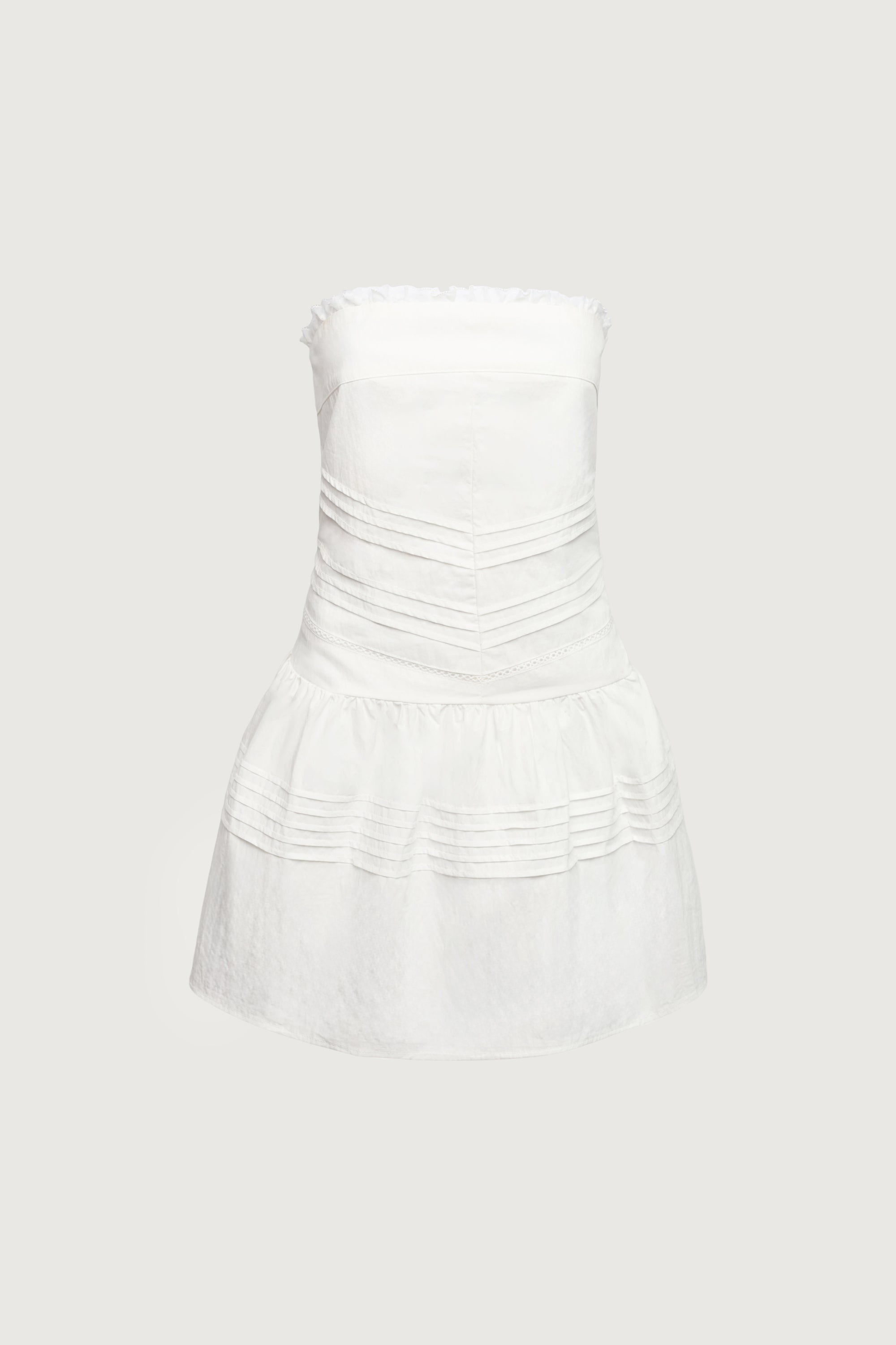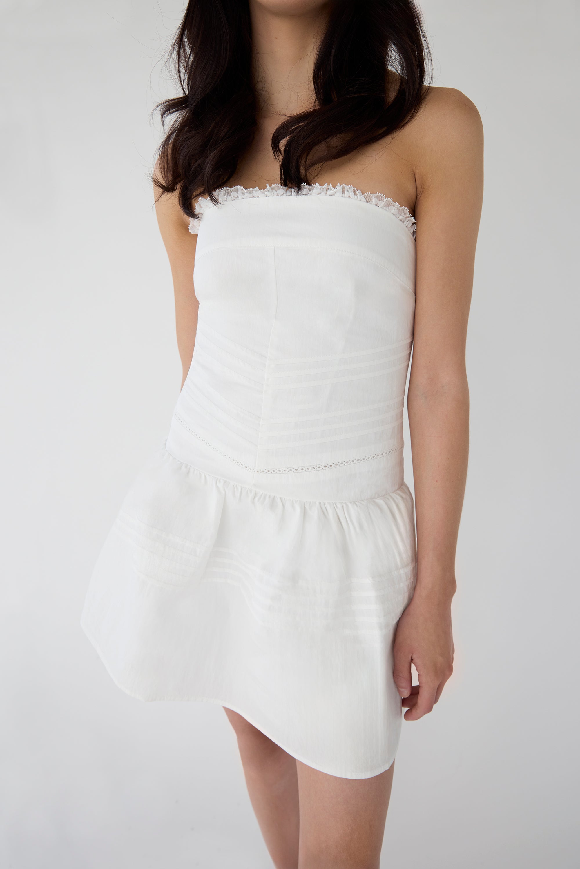 This strapless dress can be worn for any occasion, making this piece a perfect addition to any wardrobe, due to its versatility. The dress features pintuck detailing across the dress, gathered seams, and lace along the top trim.