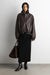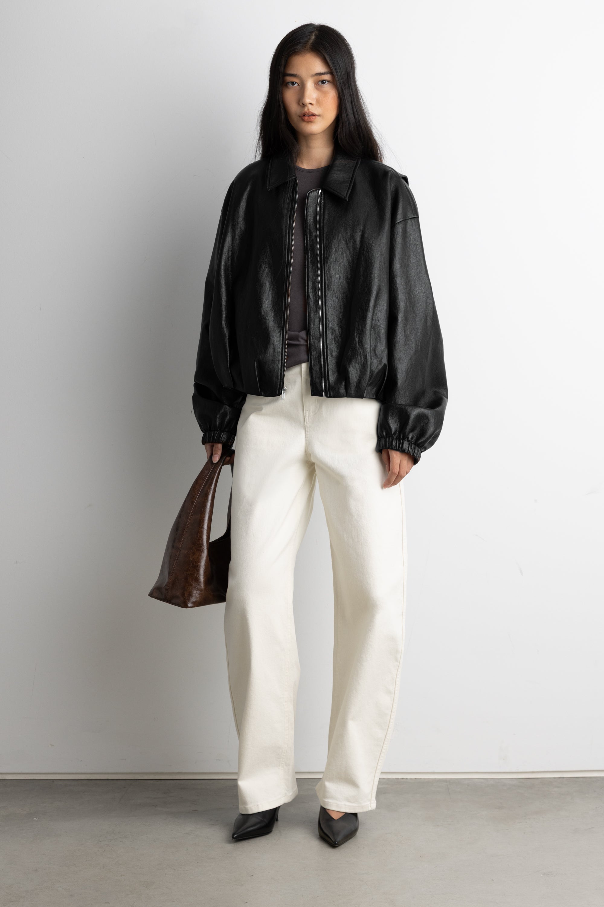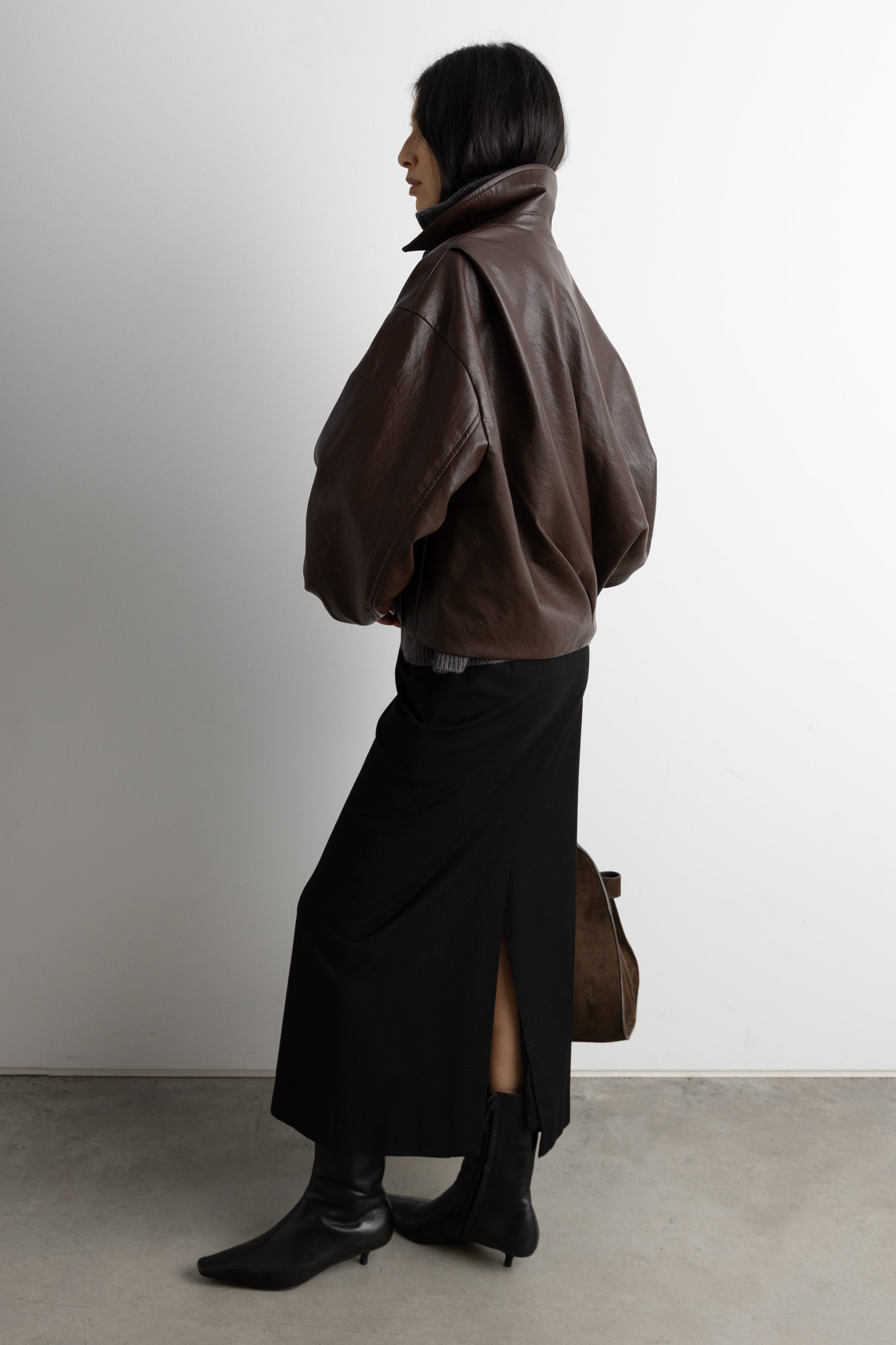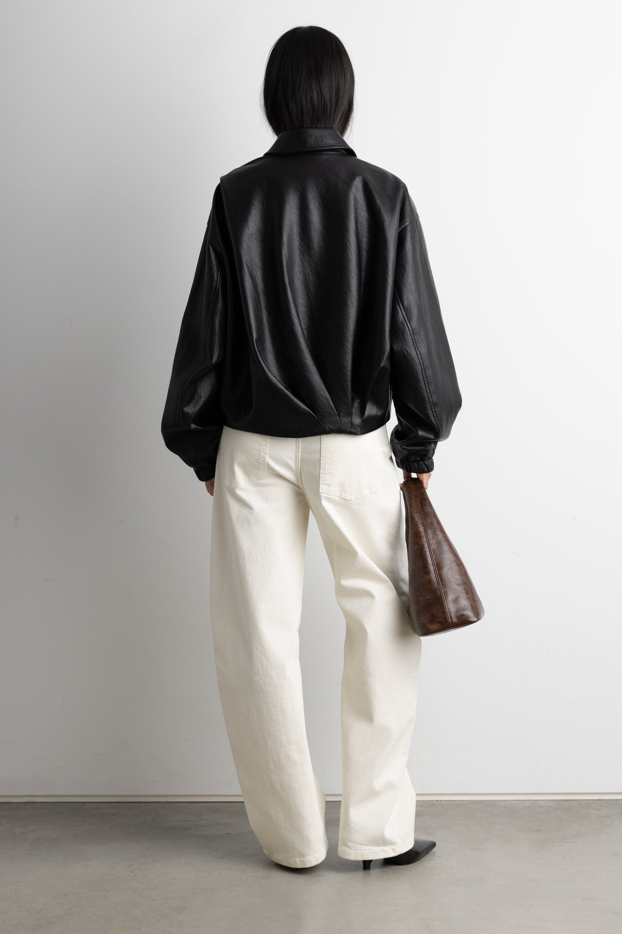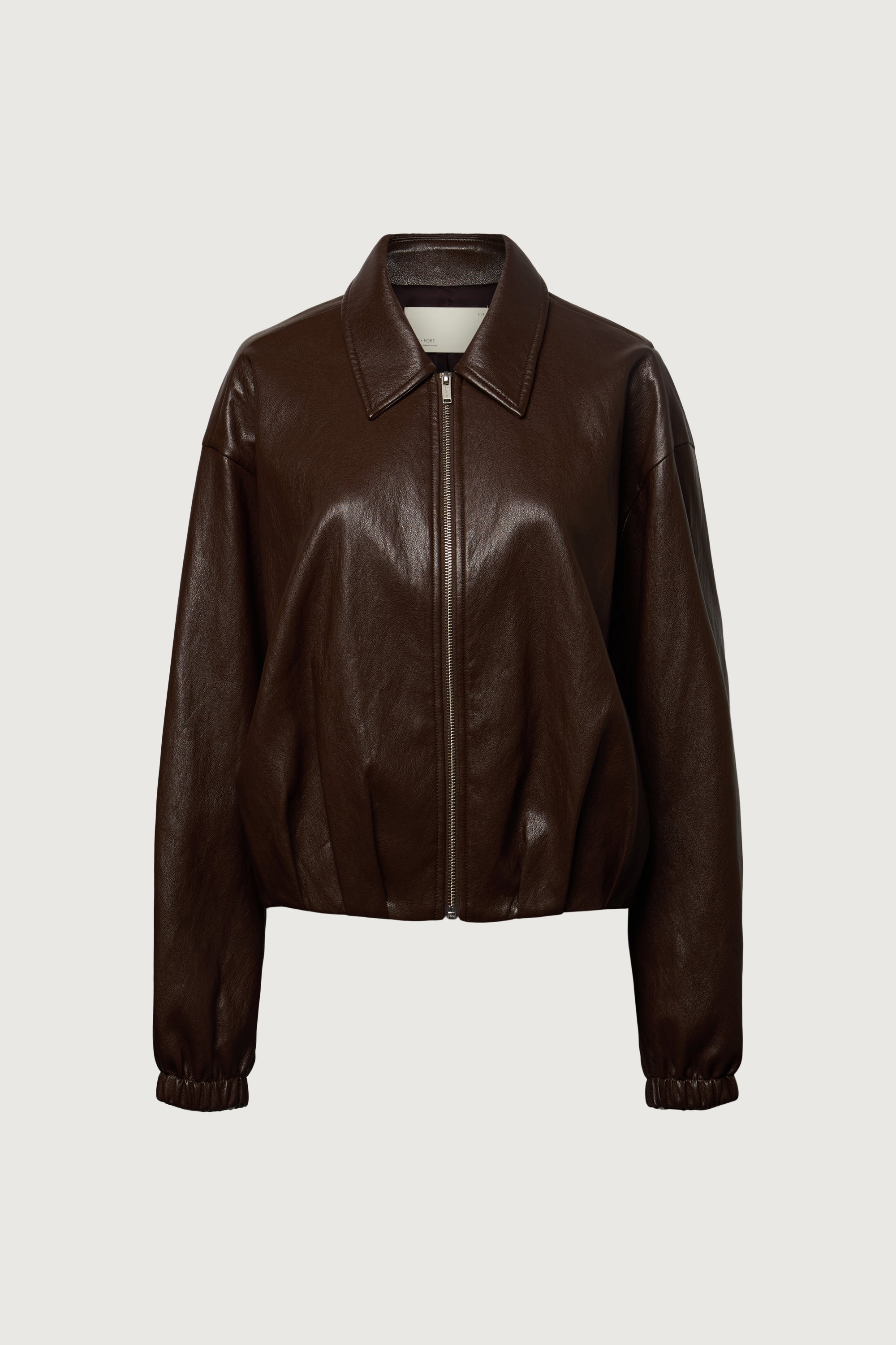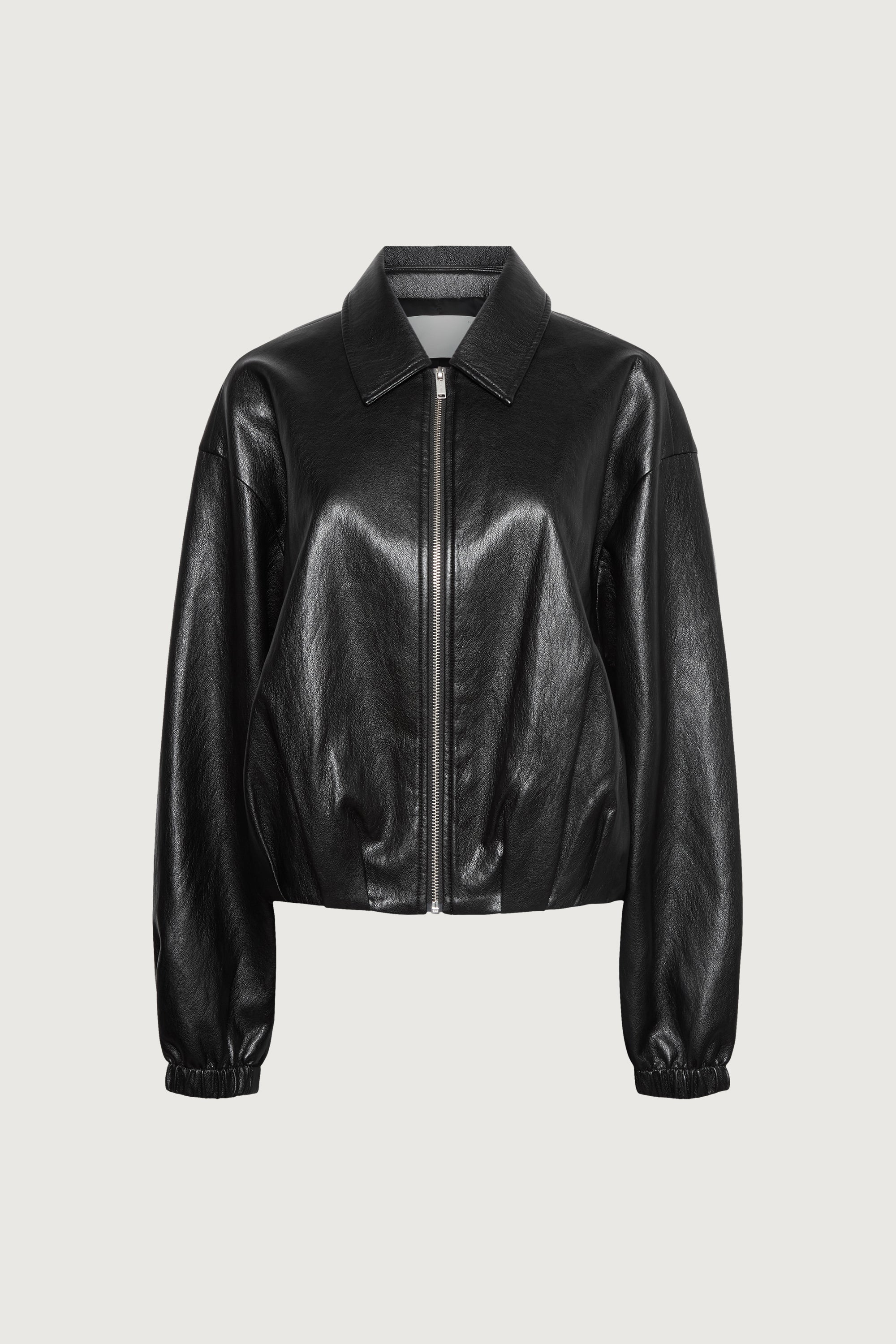 Vegan leather. Collared neckline. Zipper front. Elasticated cuffs. Front box pleats. Back diagonal folds. Lined.