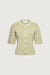 Ribbed knit. Quarter length sleeves. Waist cinched silhouette. Corozo buttons. Ribbed trims.