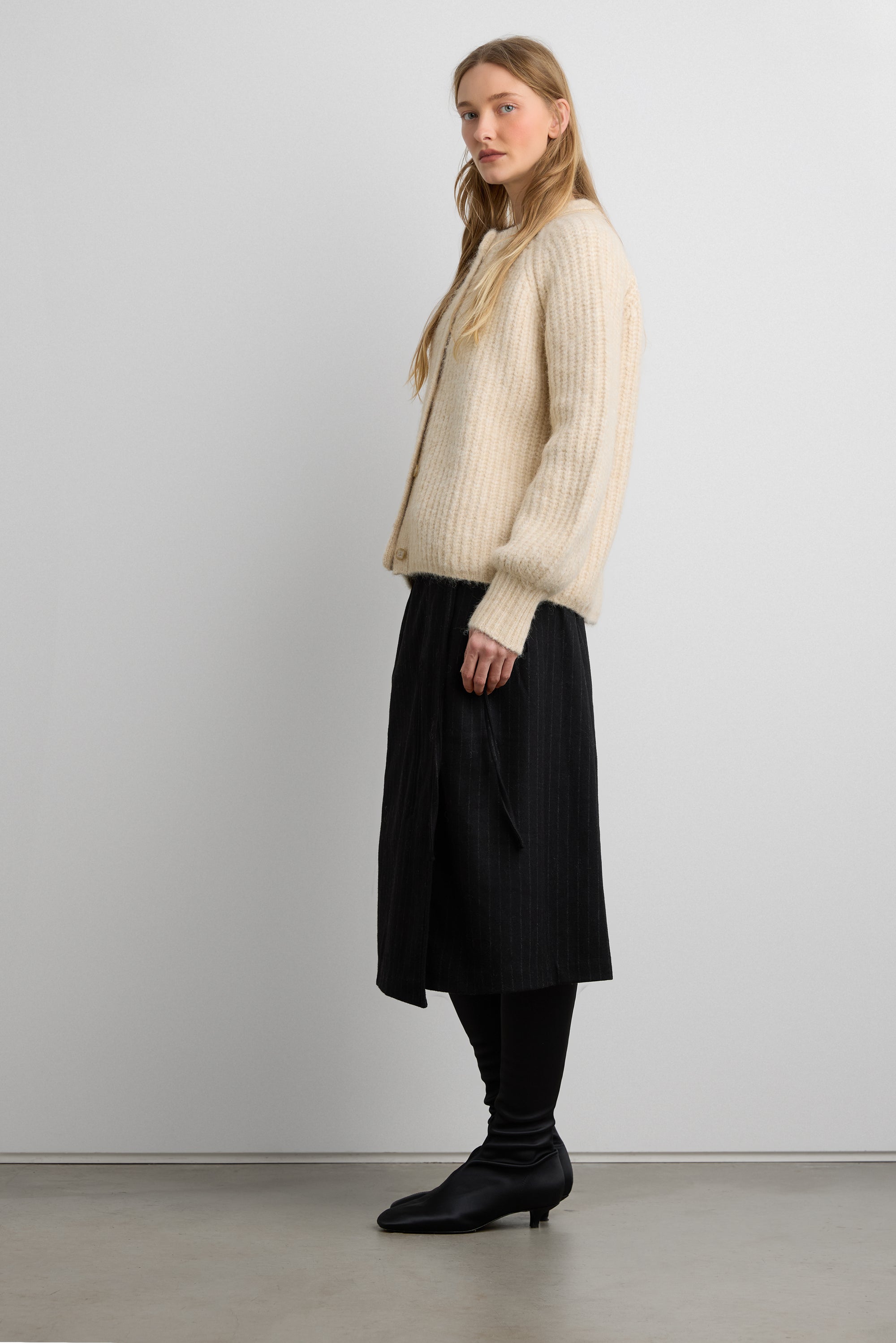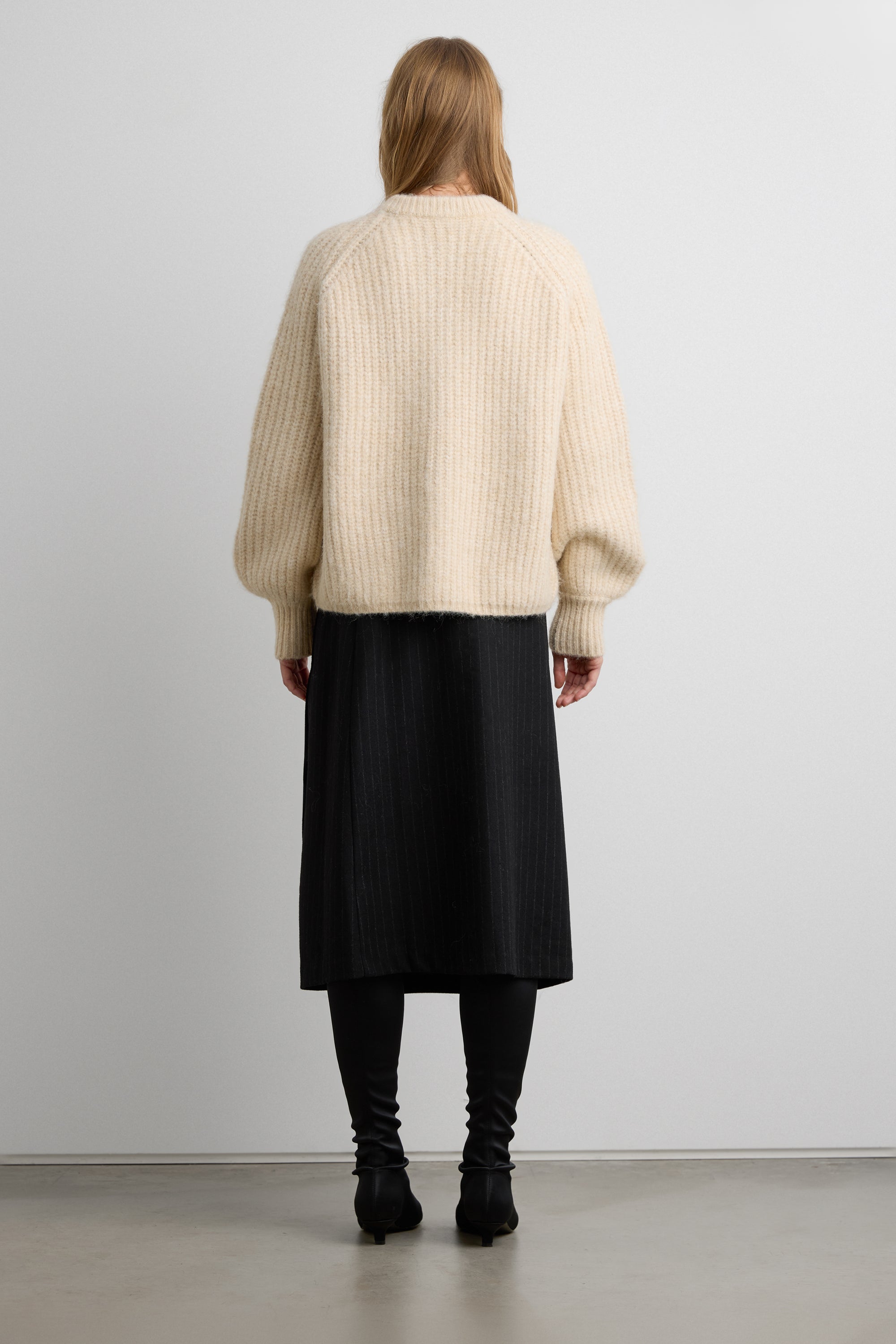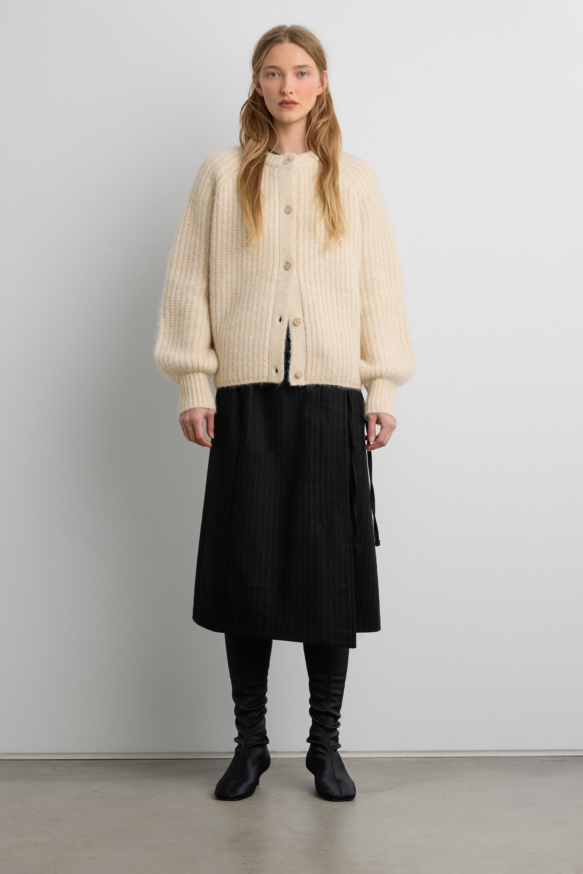 Chunky knit. Button front. Ribbed trims. Raglan sleeves.