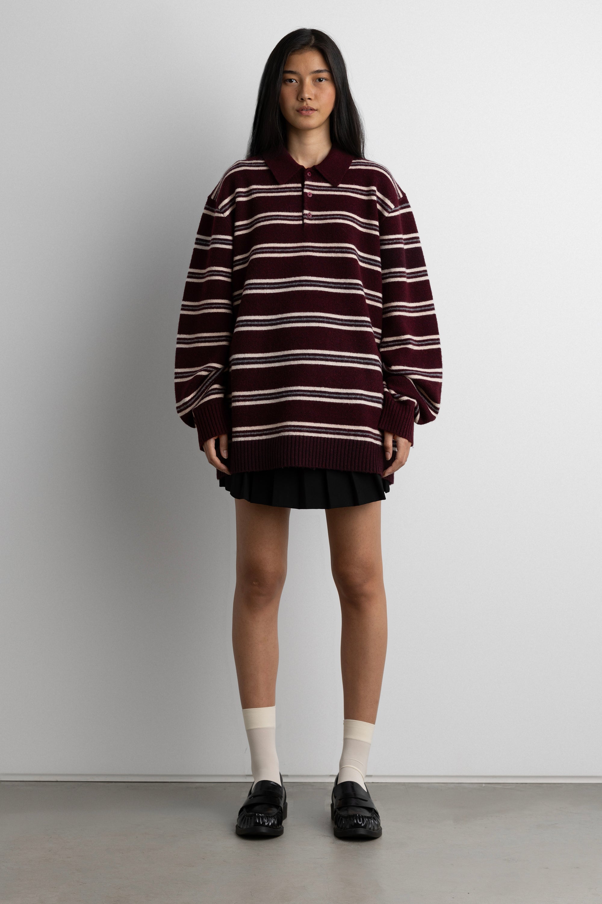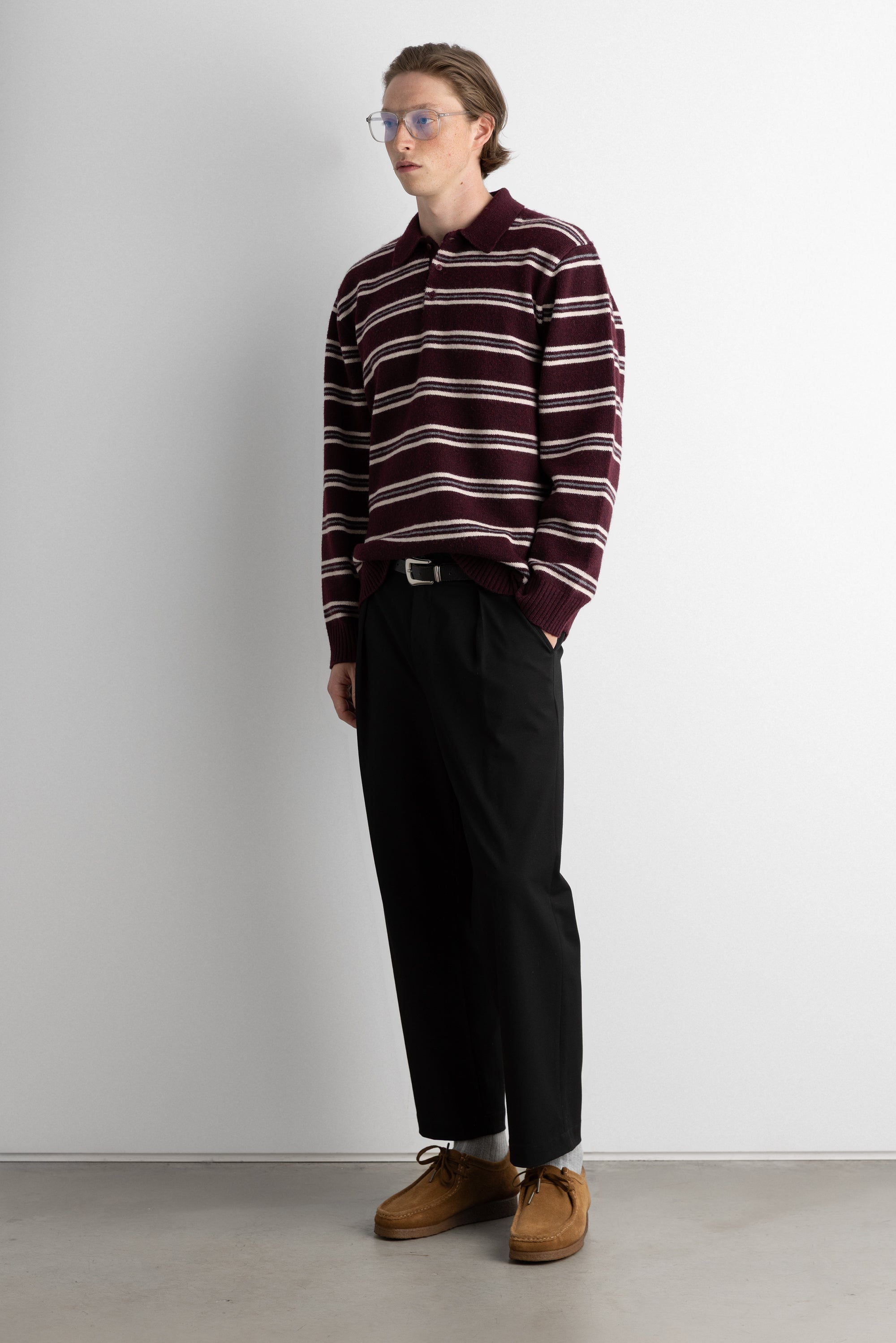 Relaxed fit. Recycled poly blend stretch fabric. Striped design. Collar. Embedded placket. Quarter button up with mother of pearl buttons. 28” based on size M.