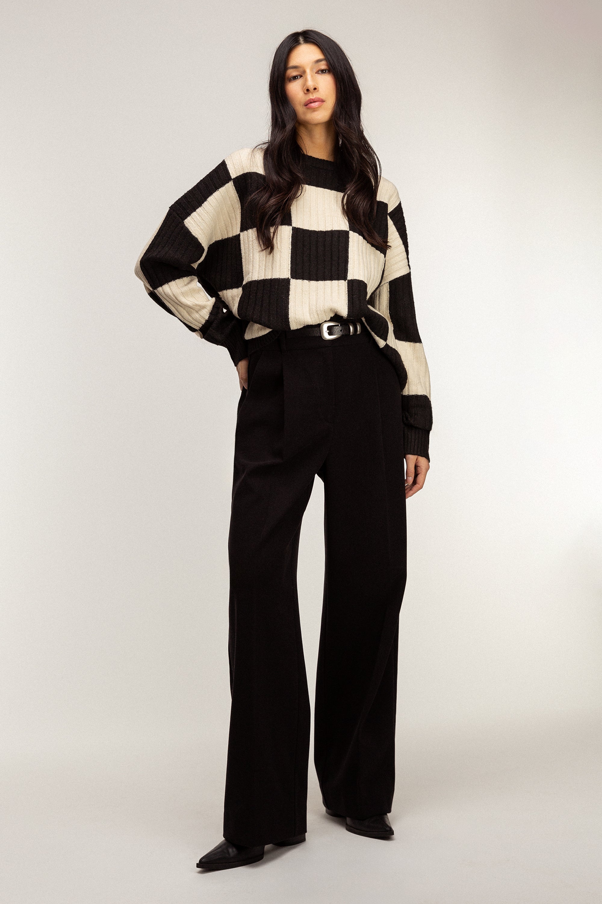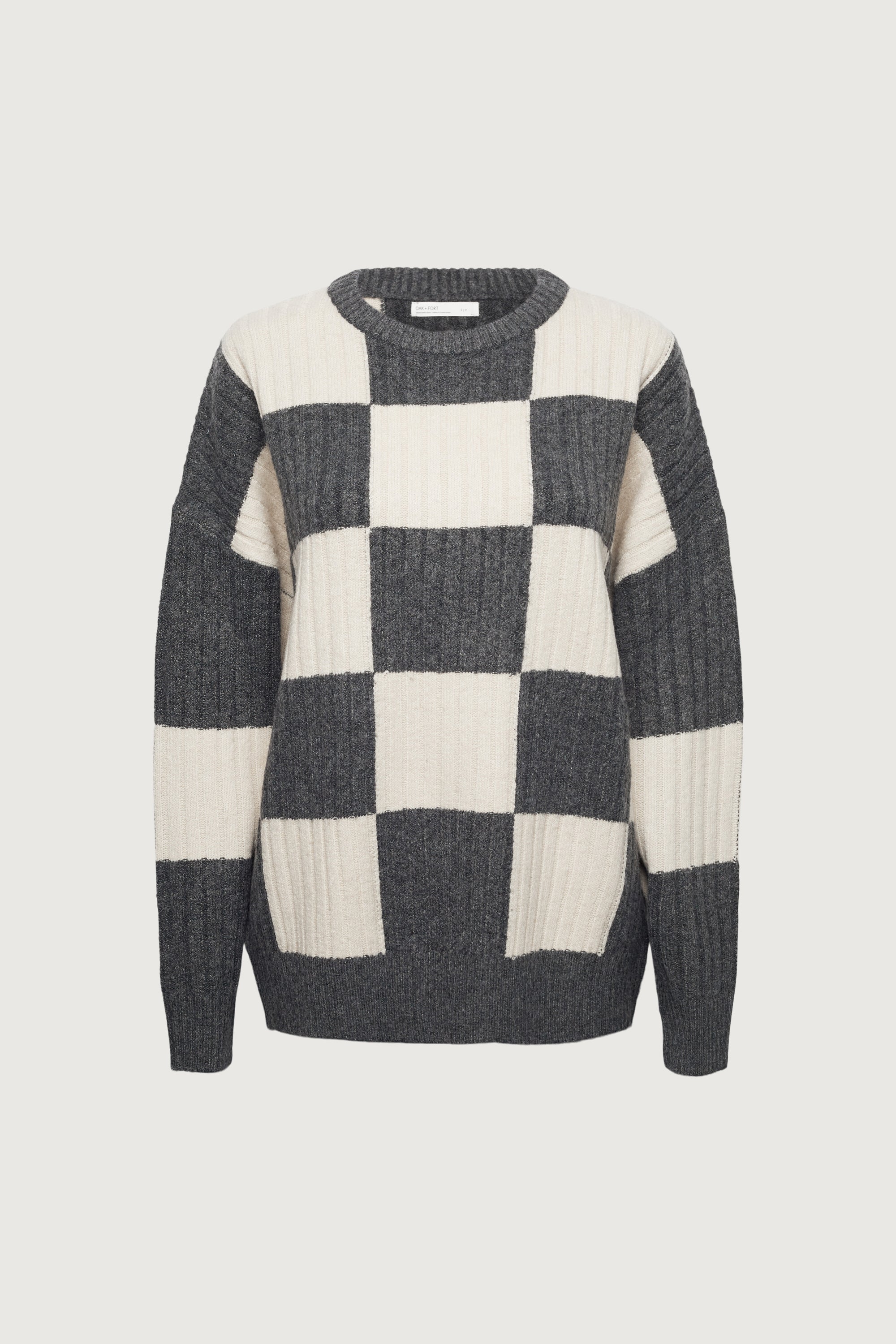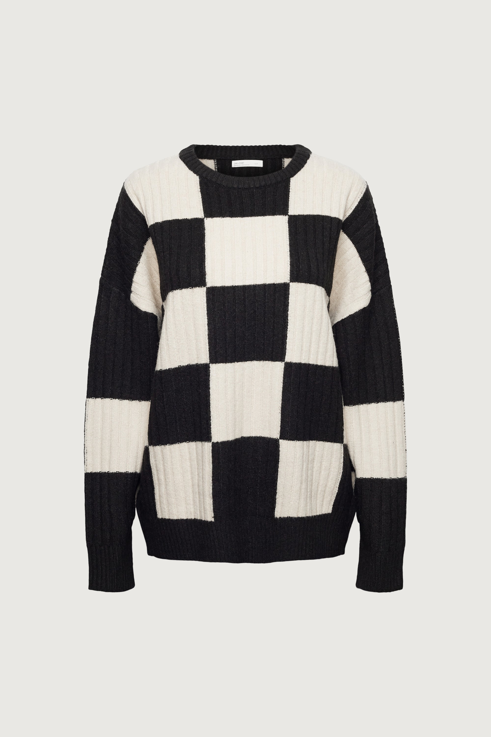 Rib-knit checkered knit. Crew neckline. Dropped shoulders.