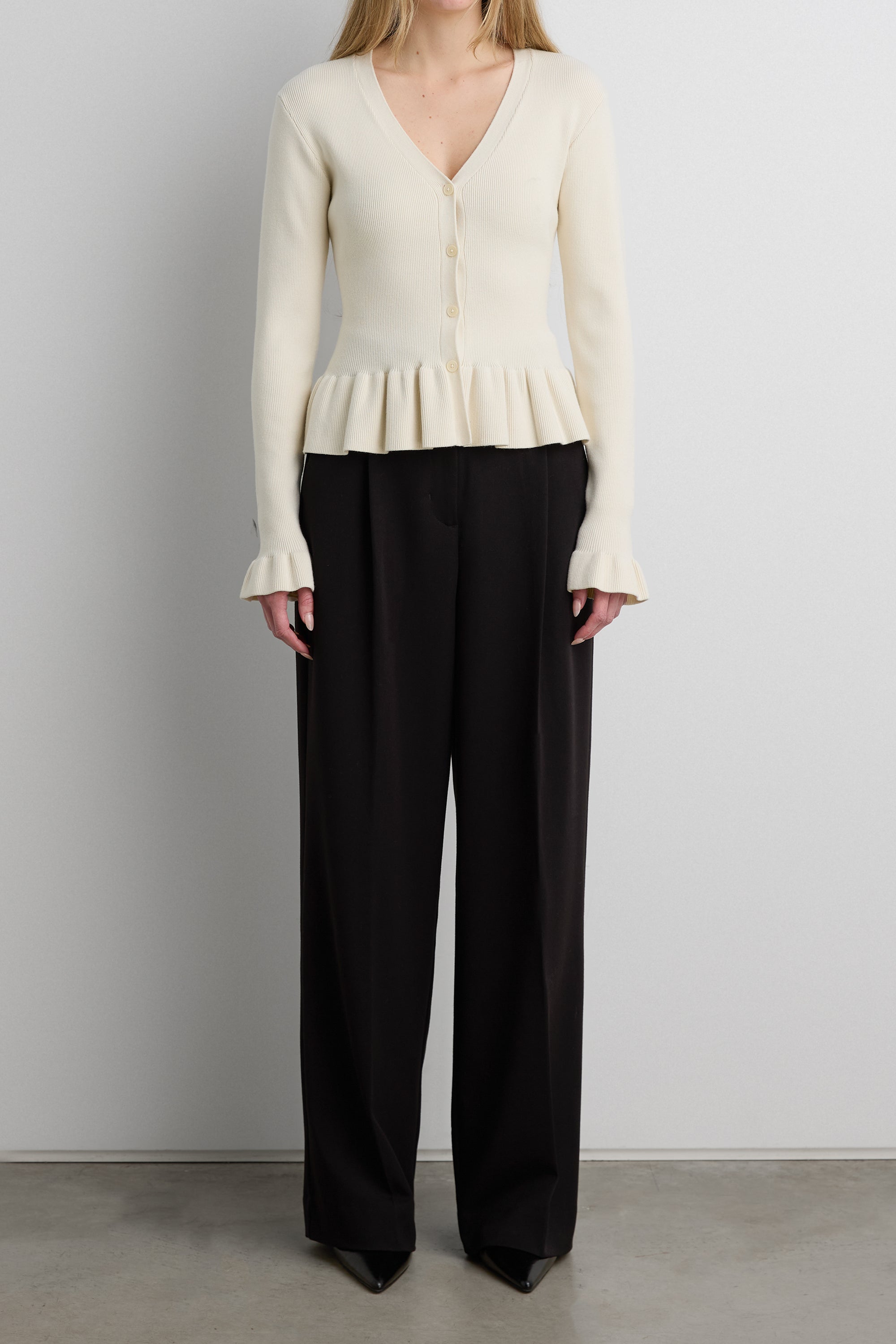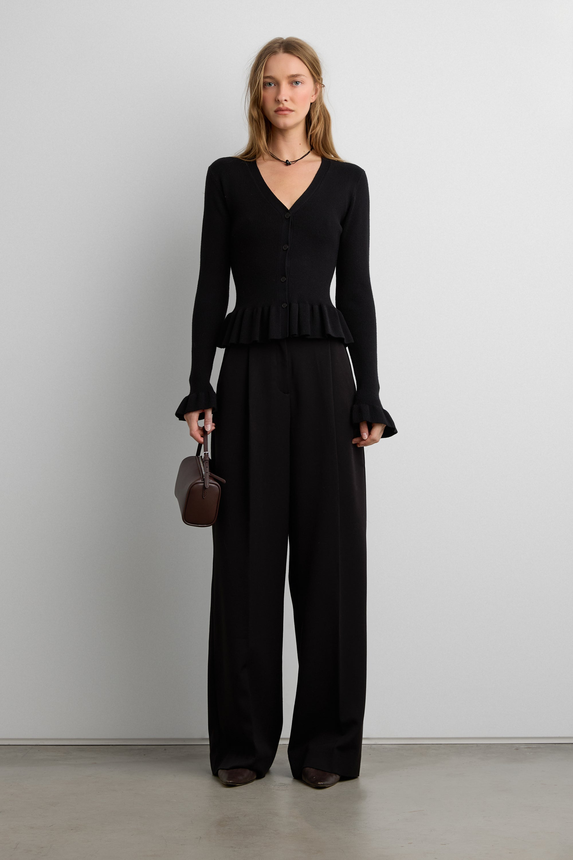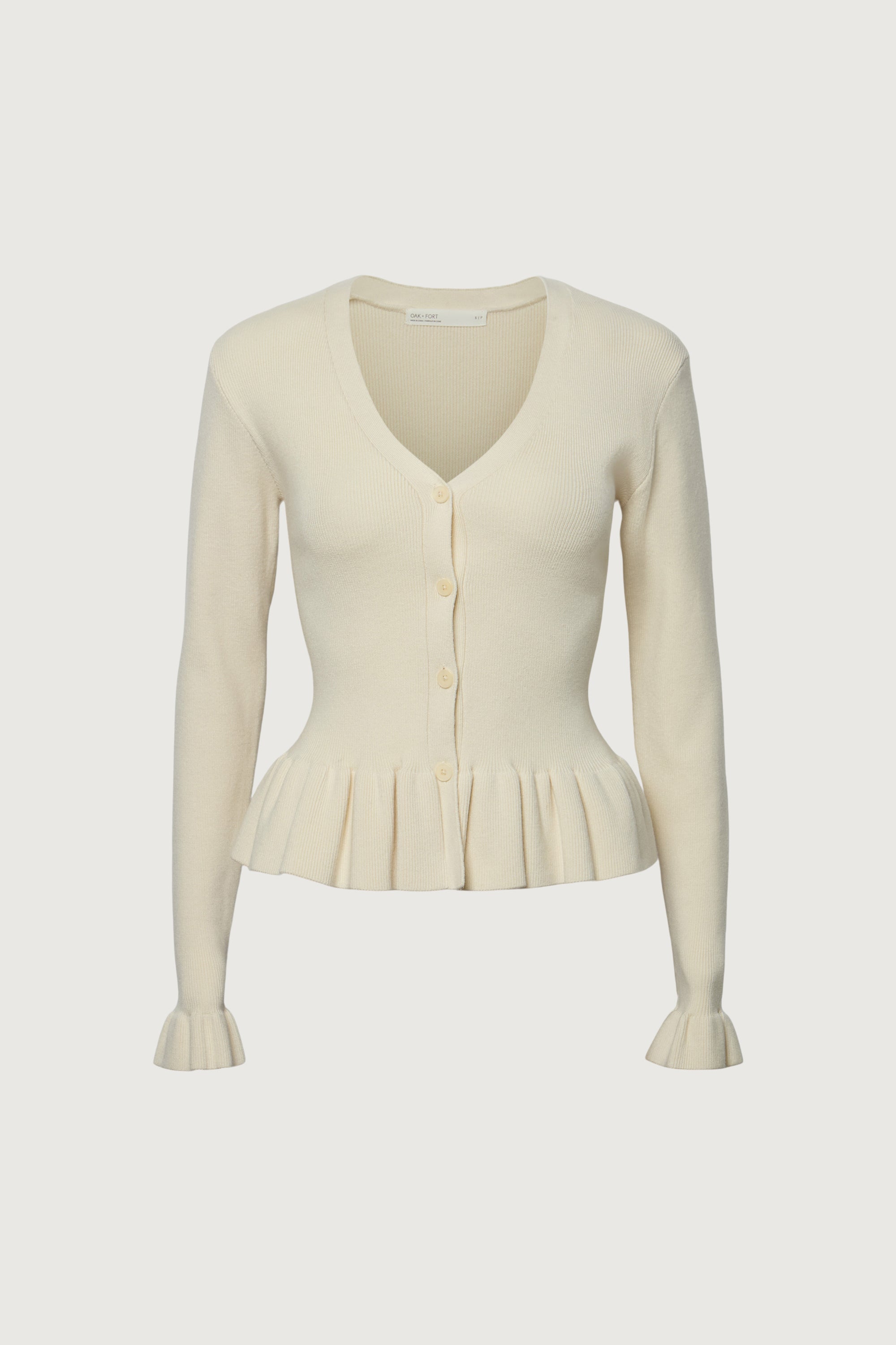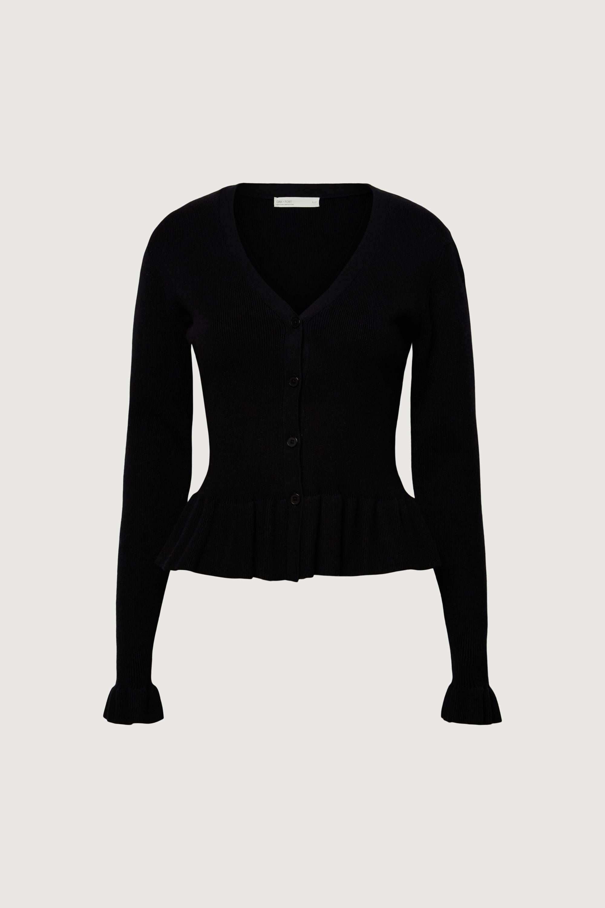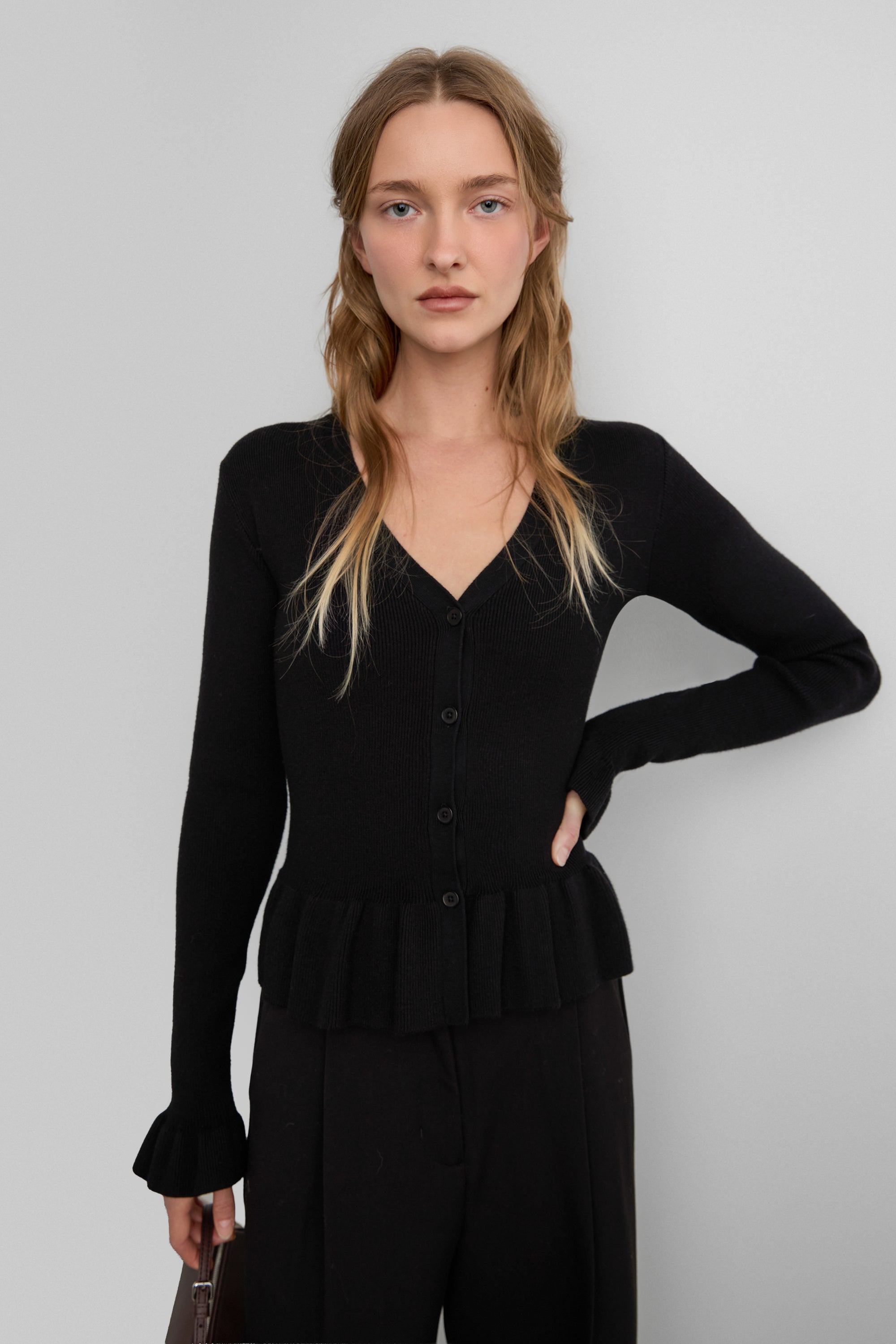 RIB-KNIT RUFFLED BUTTON FRONT CARDIGAN