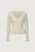 Ribbed knit. V-neckline. Button front. Ruffled trims.