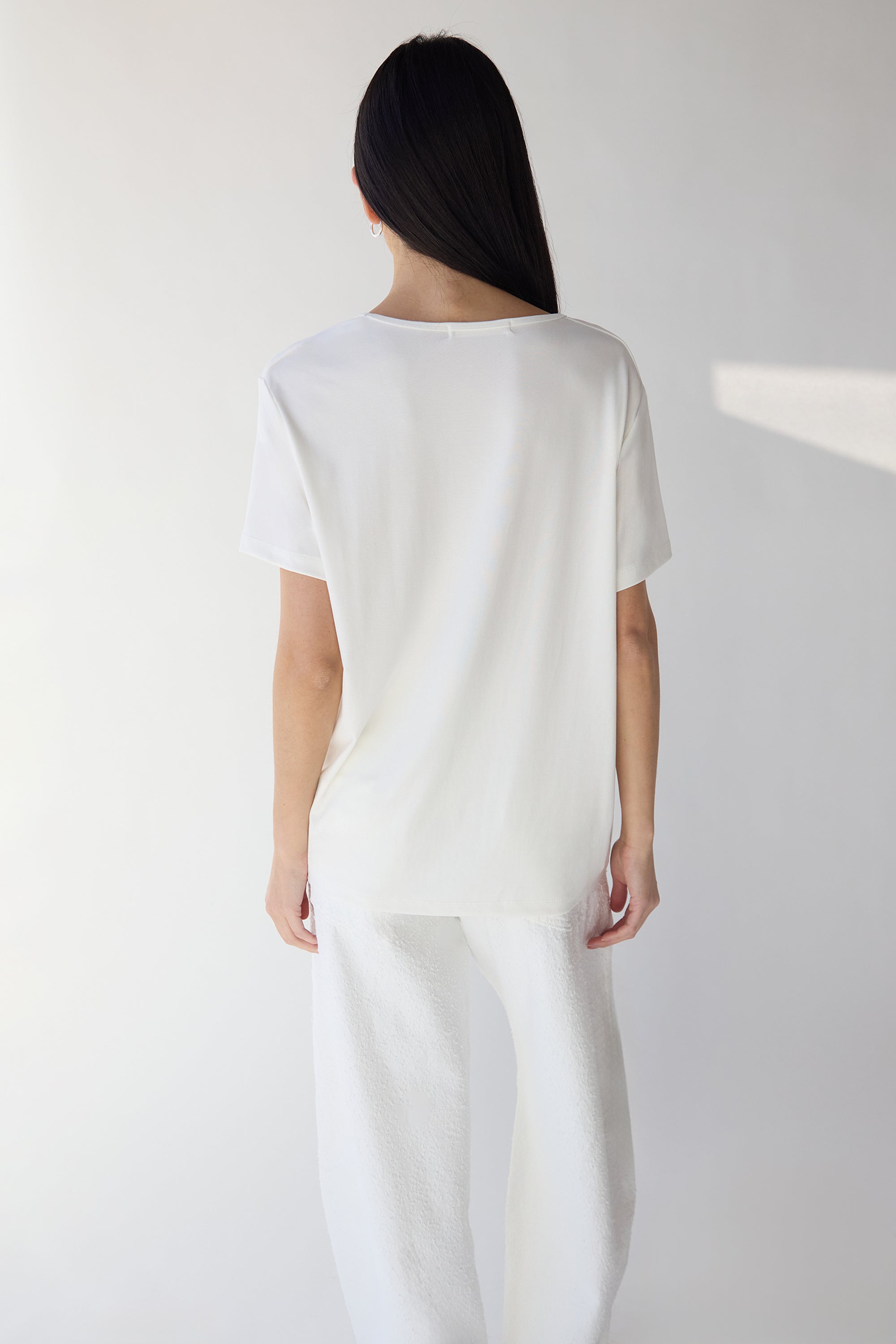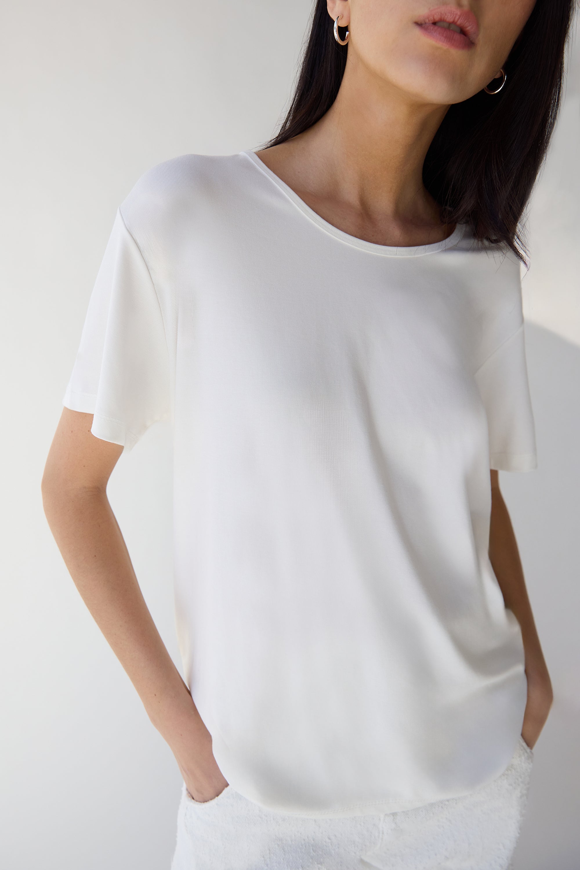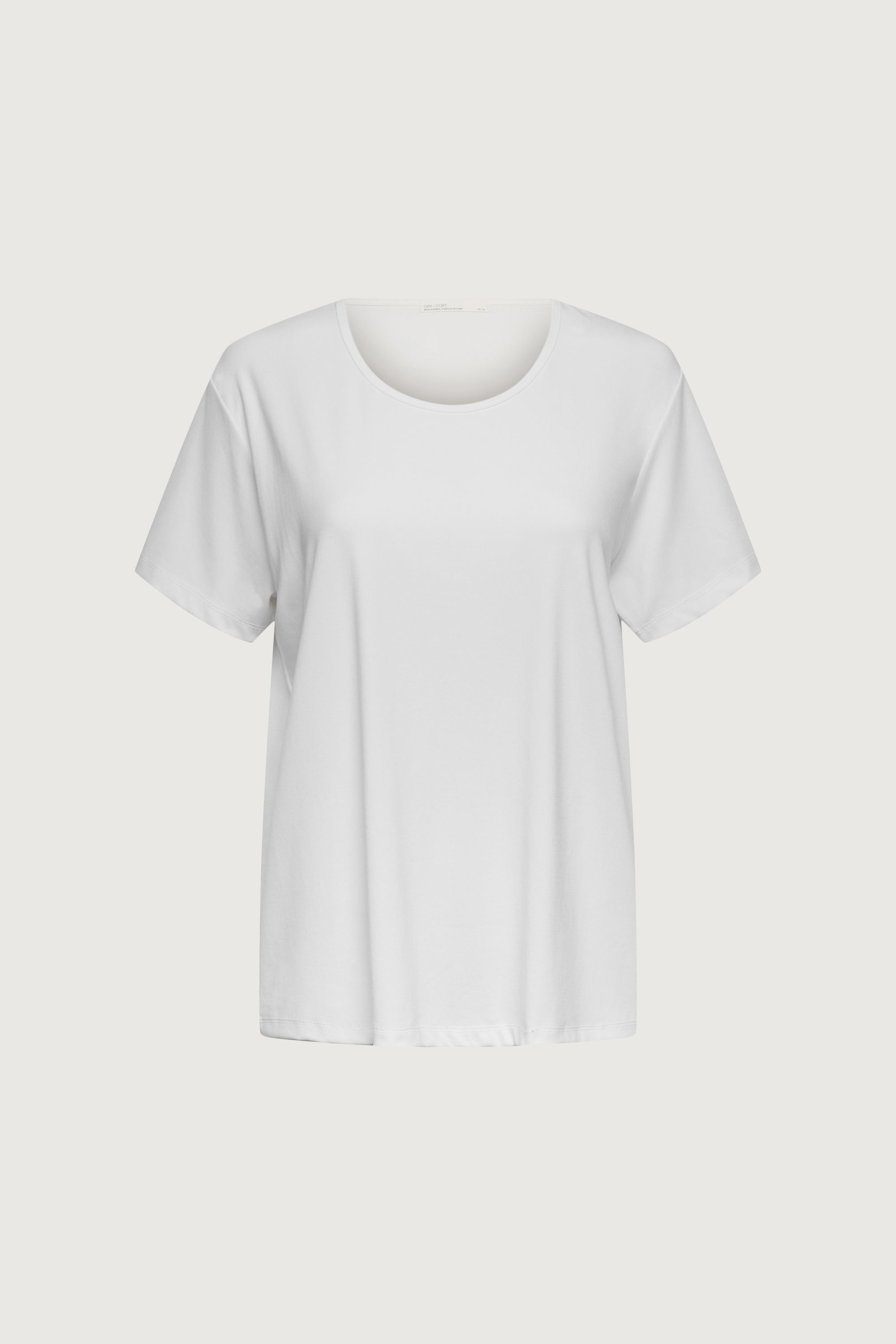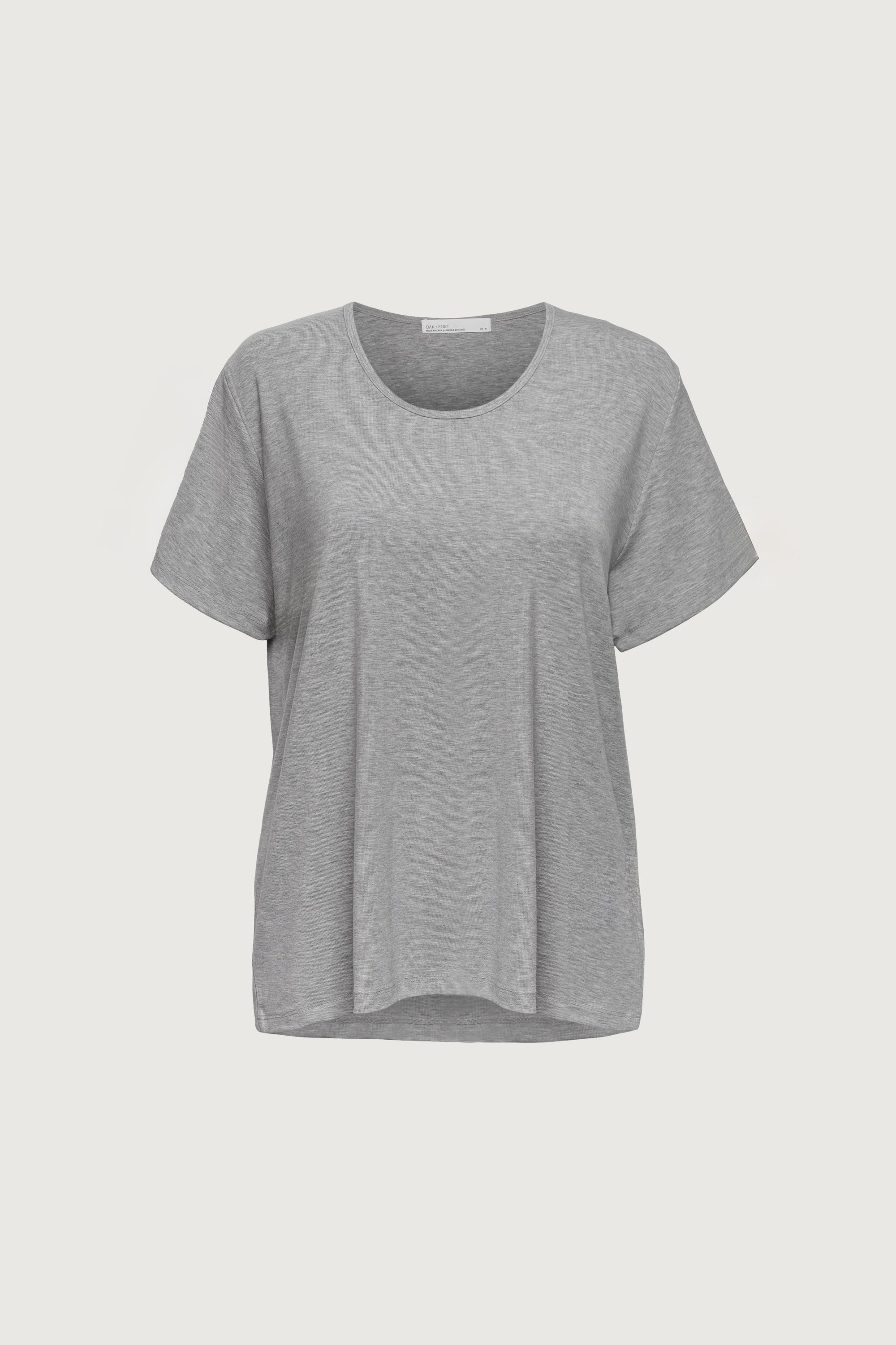 This short sleeve t-shirt has a round neck and is ultra soft to the touch. Layer this t-shirt under your favorite lounge set.