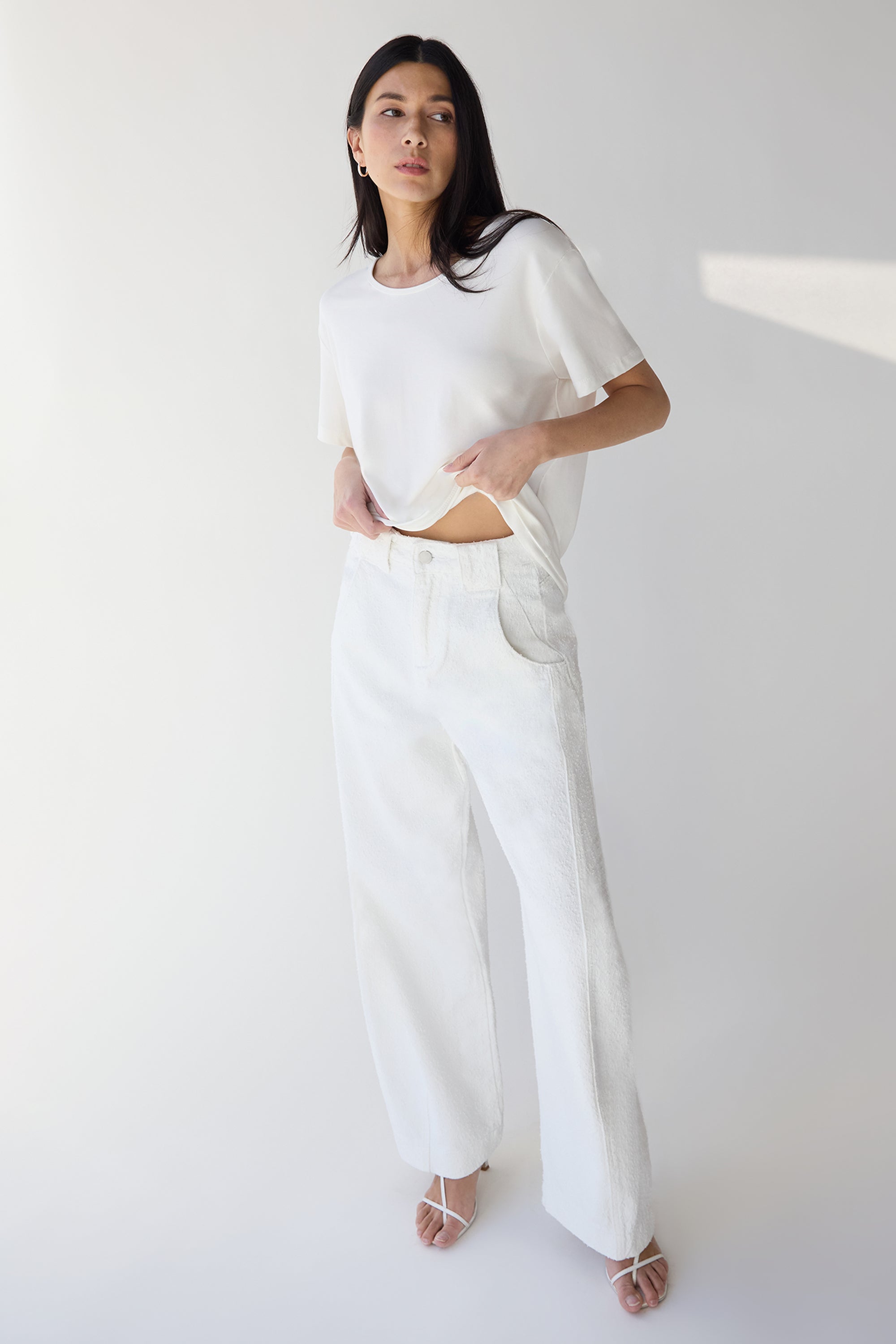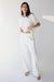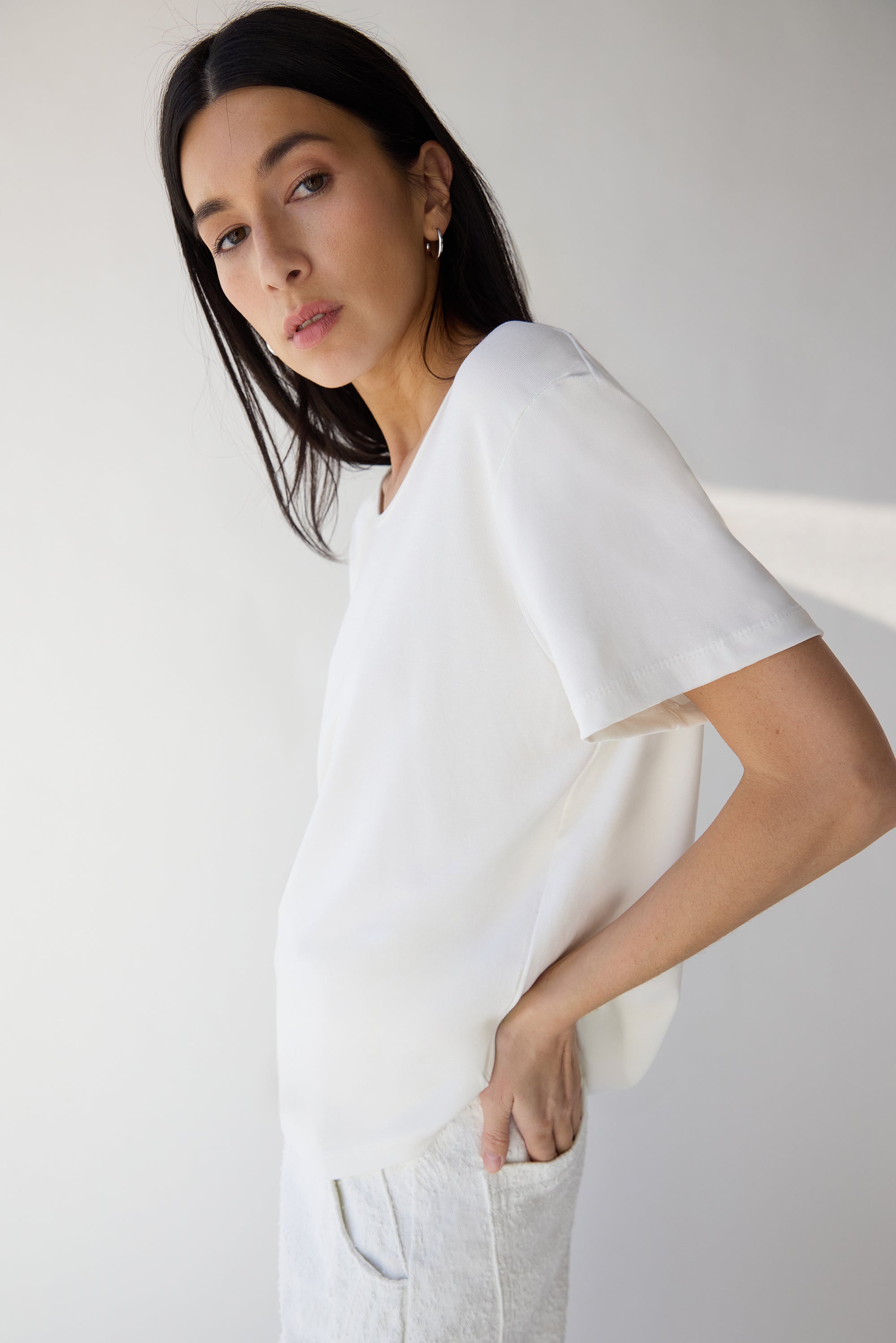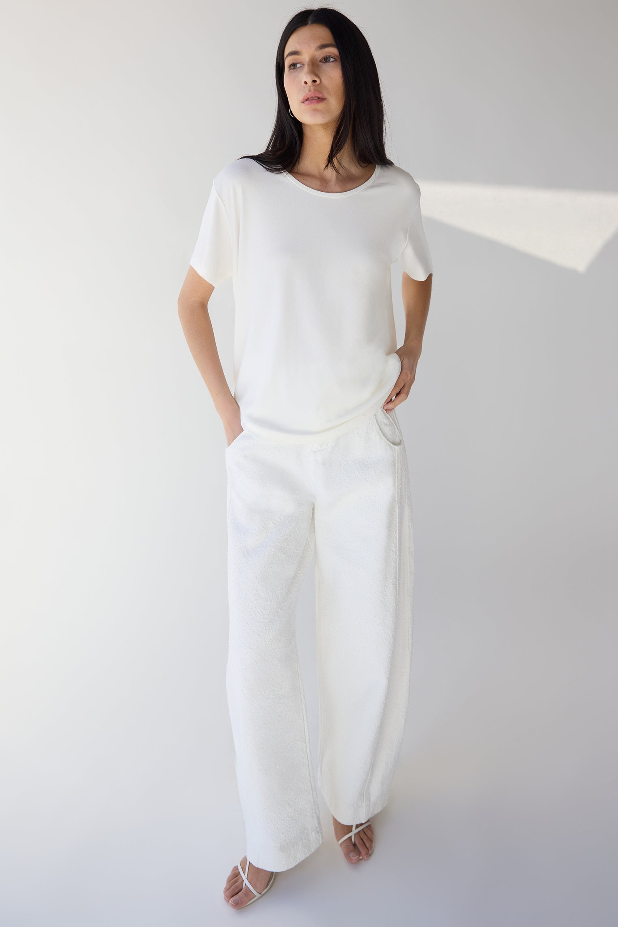 This short sleeve t-shirt has a round neck and is ultra soft to the touch. Layer this t-shirt under your favorite lounge set.