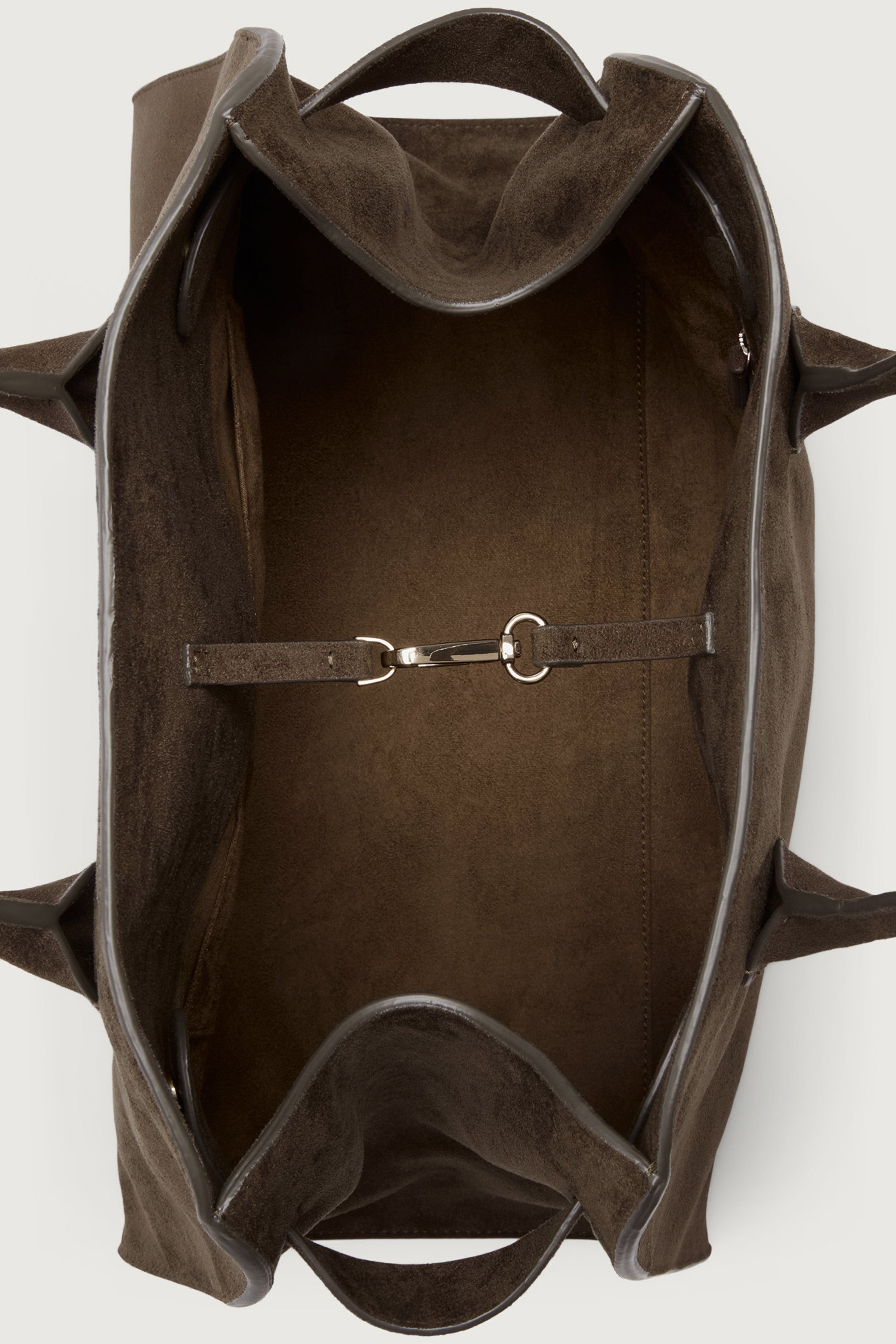 Vegan suede. Softly structured gusset side panels. Adjustable snapped belt. Lobster clasp closure. Interior includes a zip pocket and two slip pockets. Metal feet at the base.