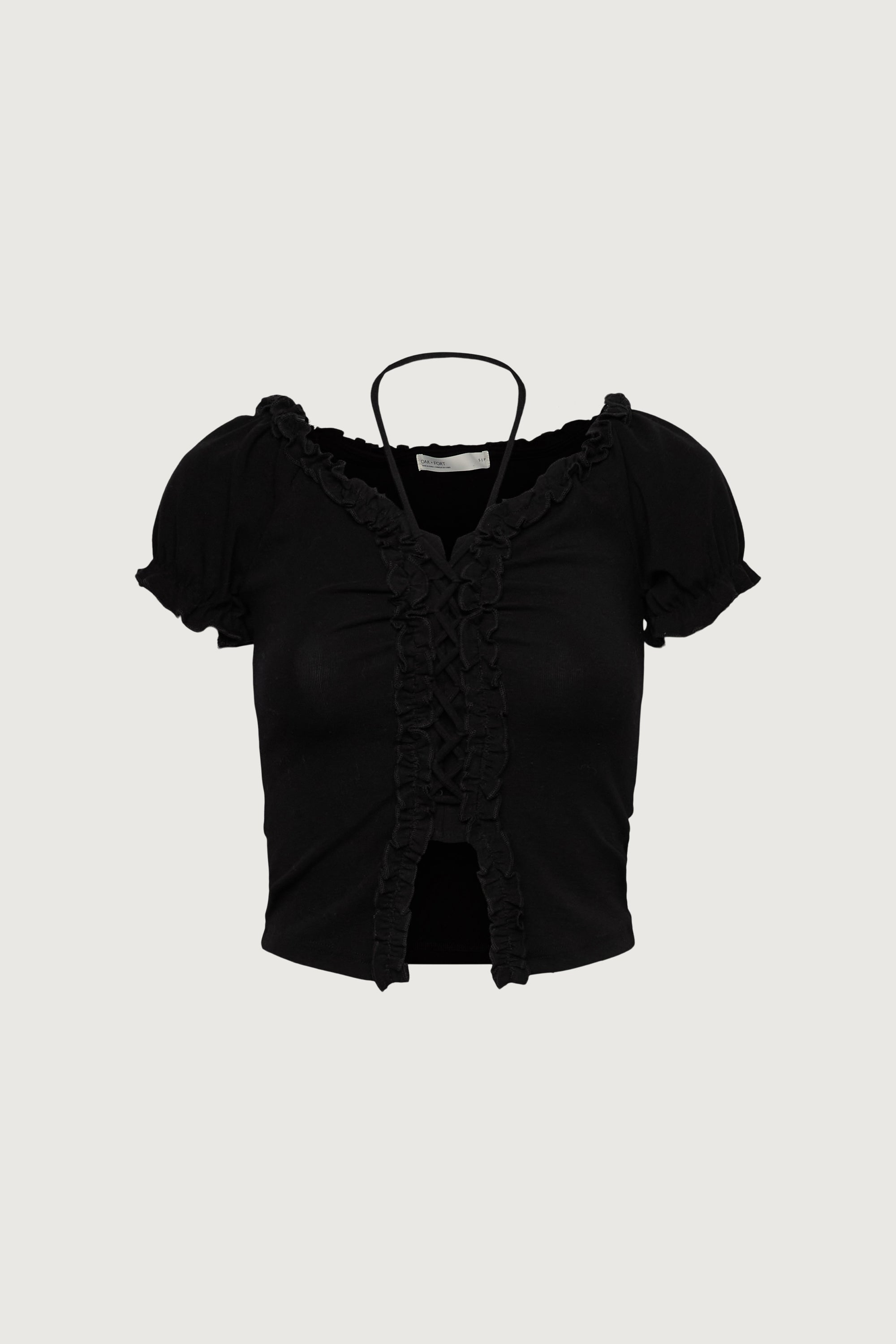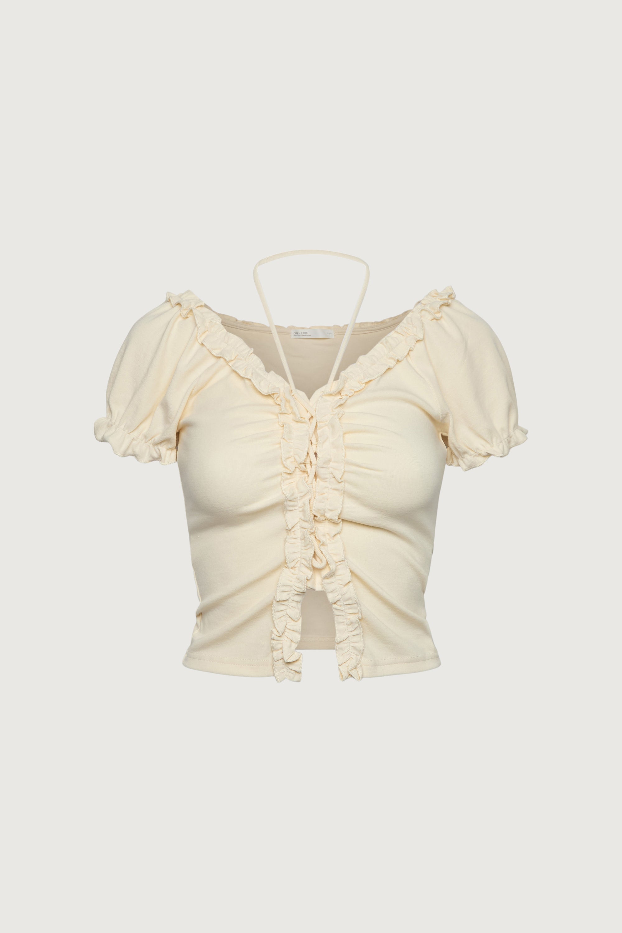 This top is designed with a stretch fabric for a comfortable slim fit. A tie closure runs along the front and is secured behind the neck. The top features a wide neck and ruffles along the trims. This top that can be worn day to night, and is a perfect addition to your wardrobe.