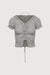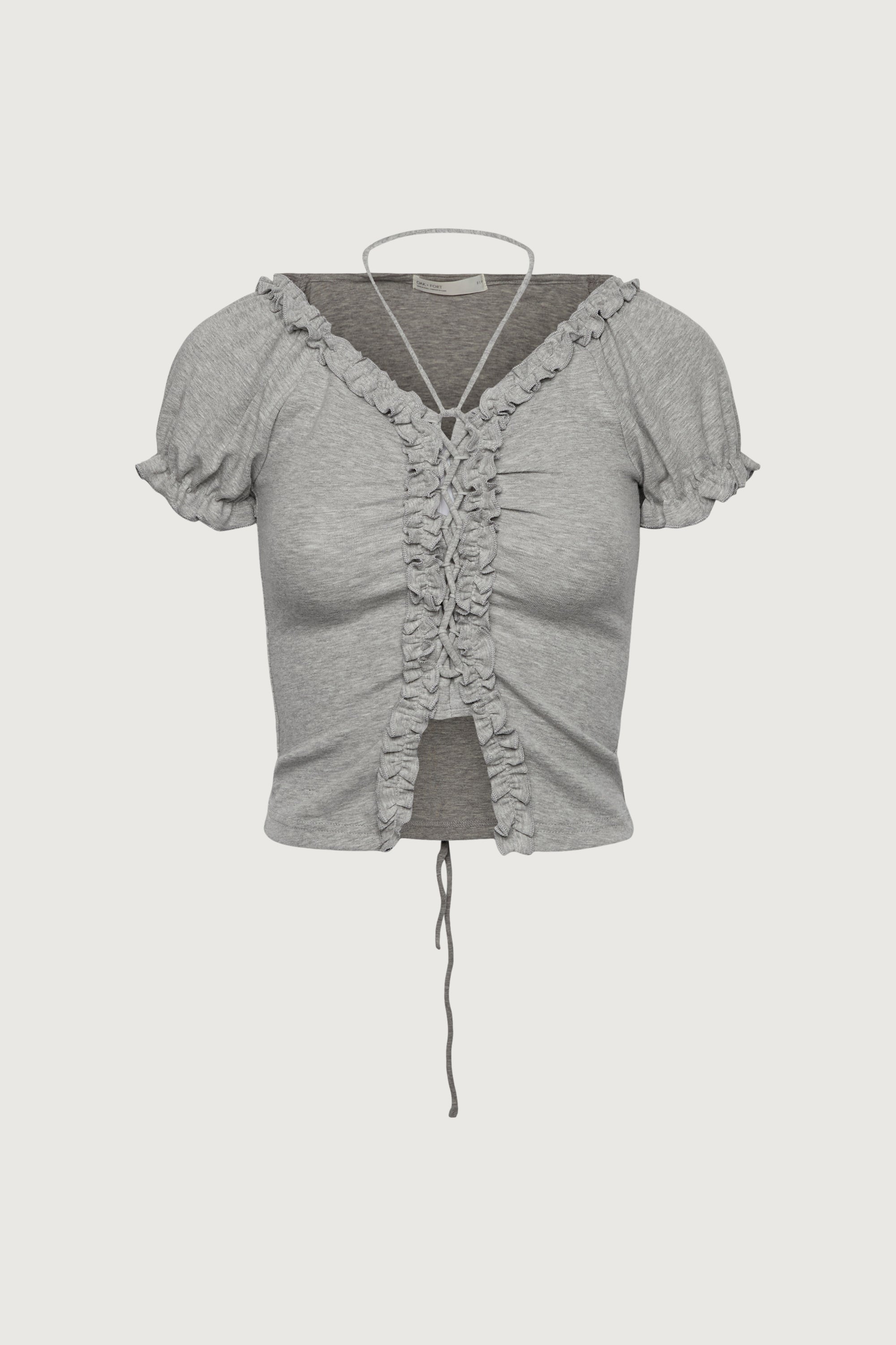 Stretch fabric. Tie closure. Wide neck. Ruffles.