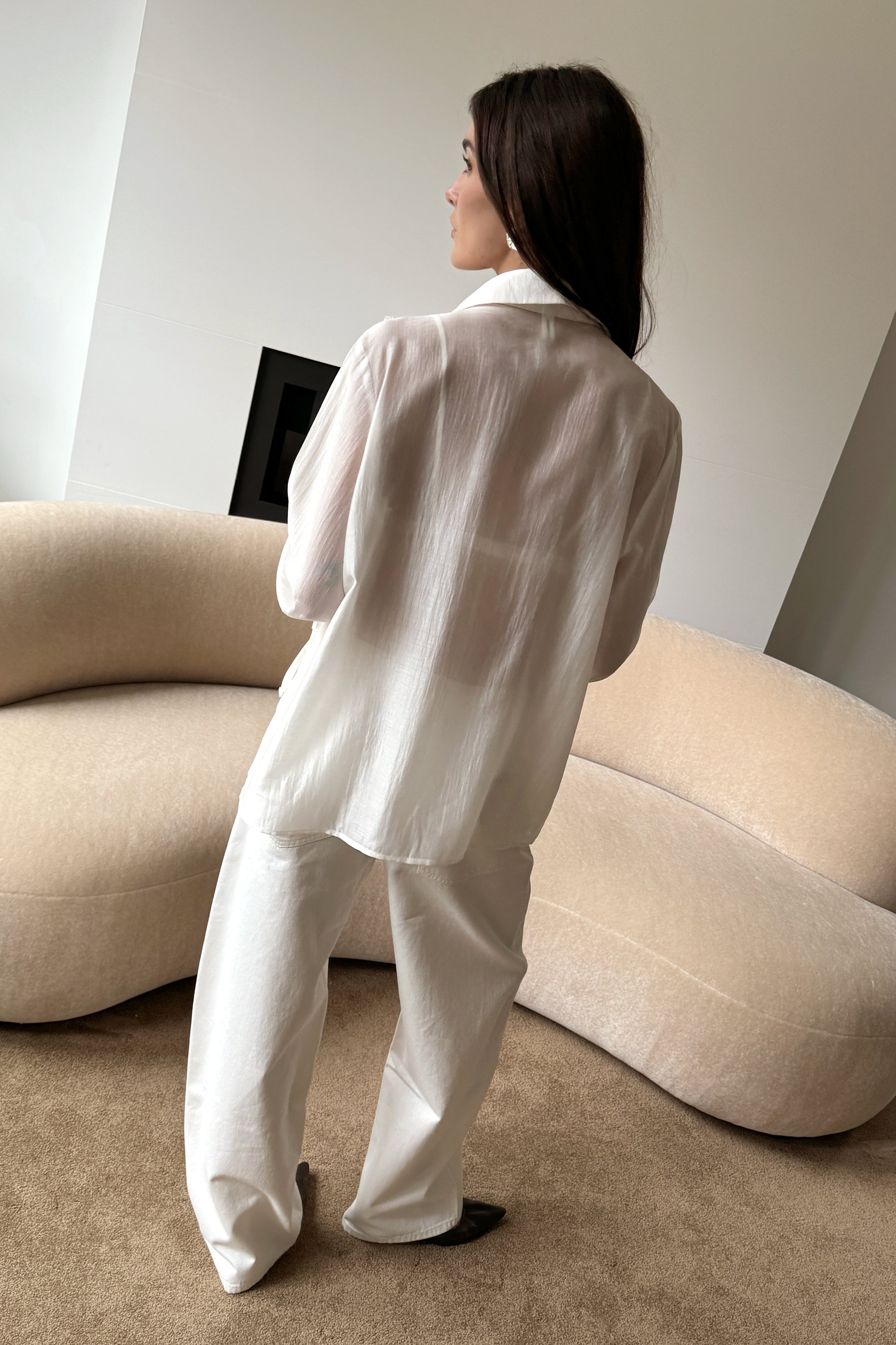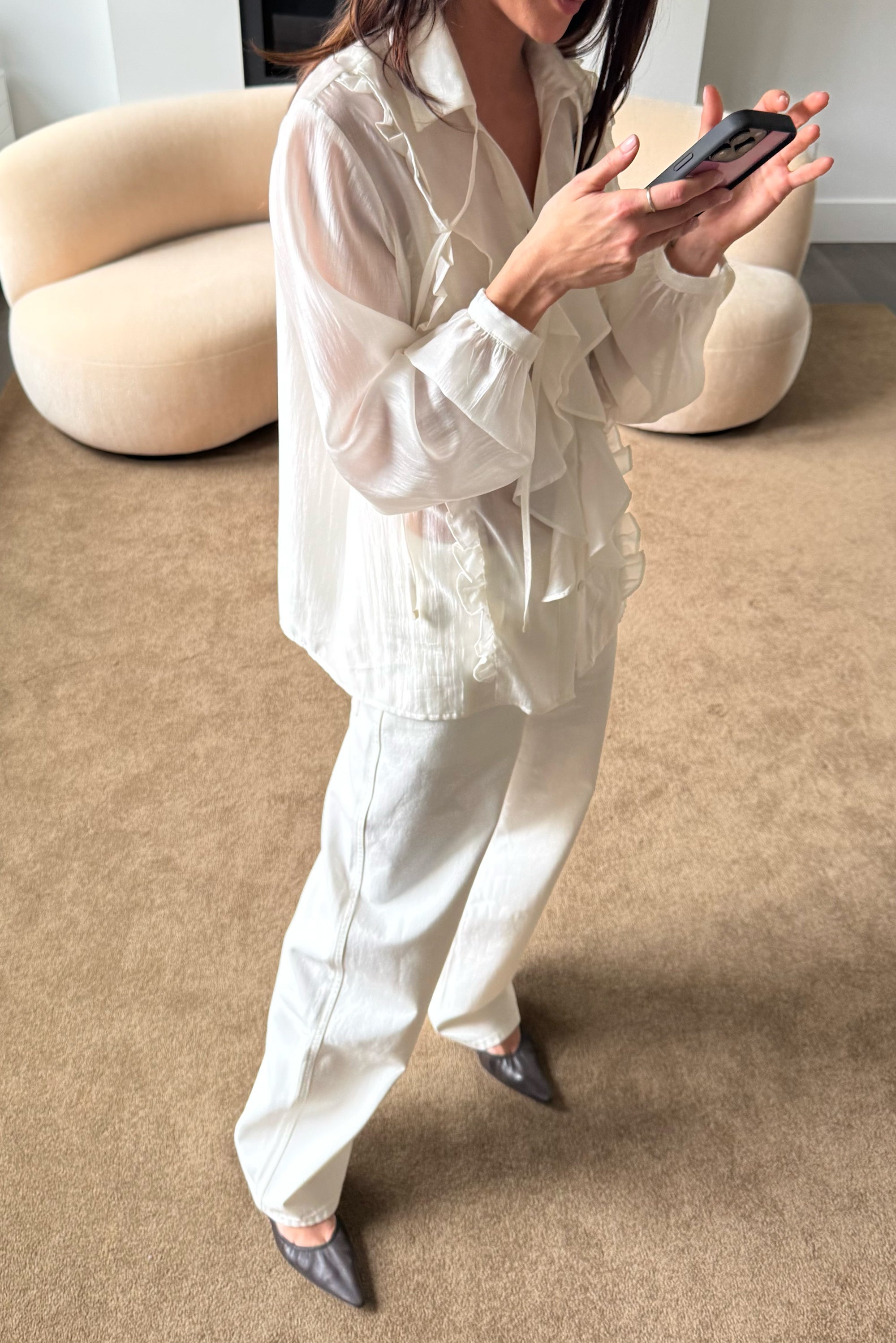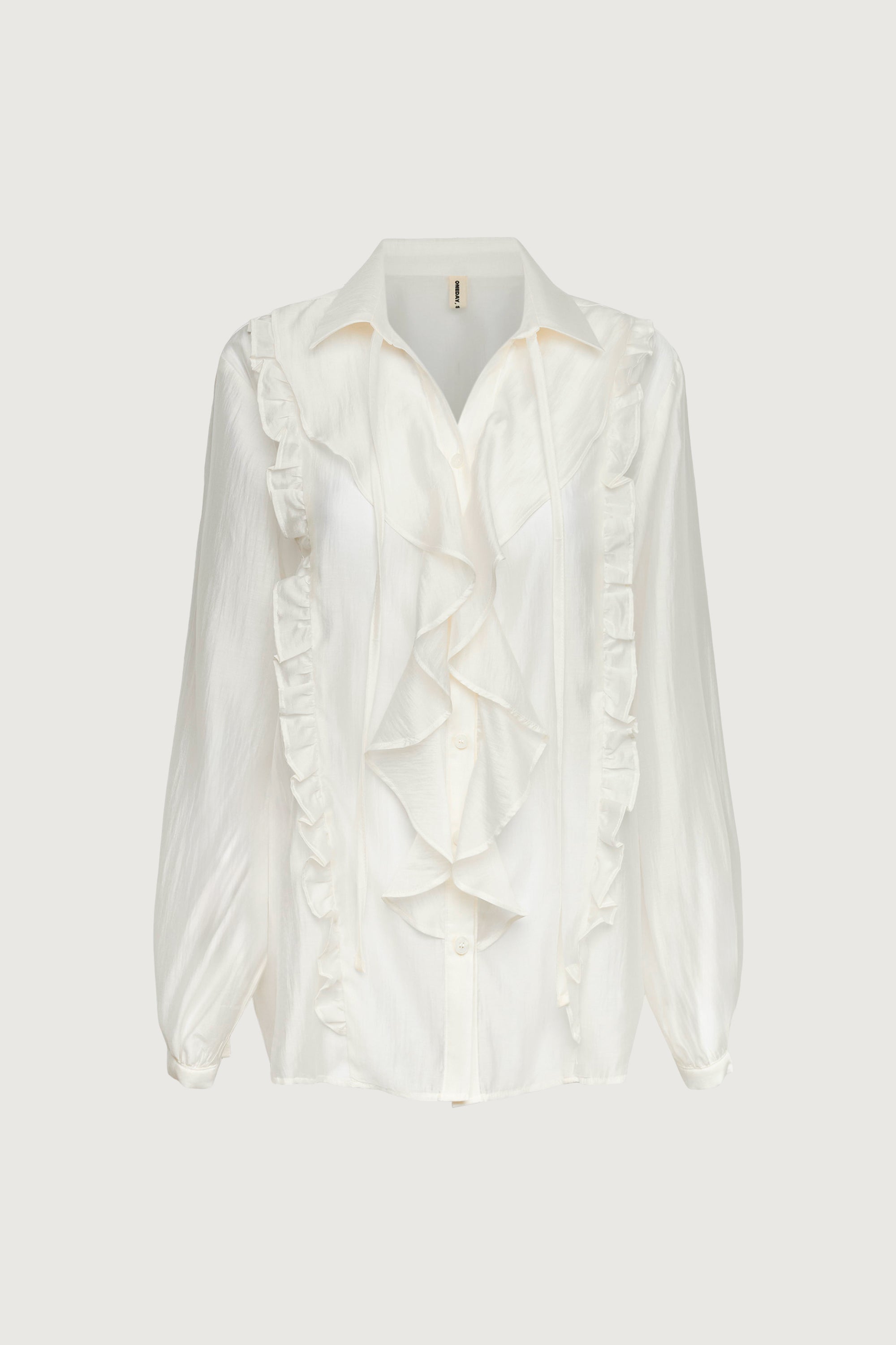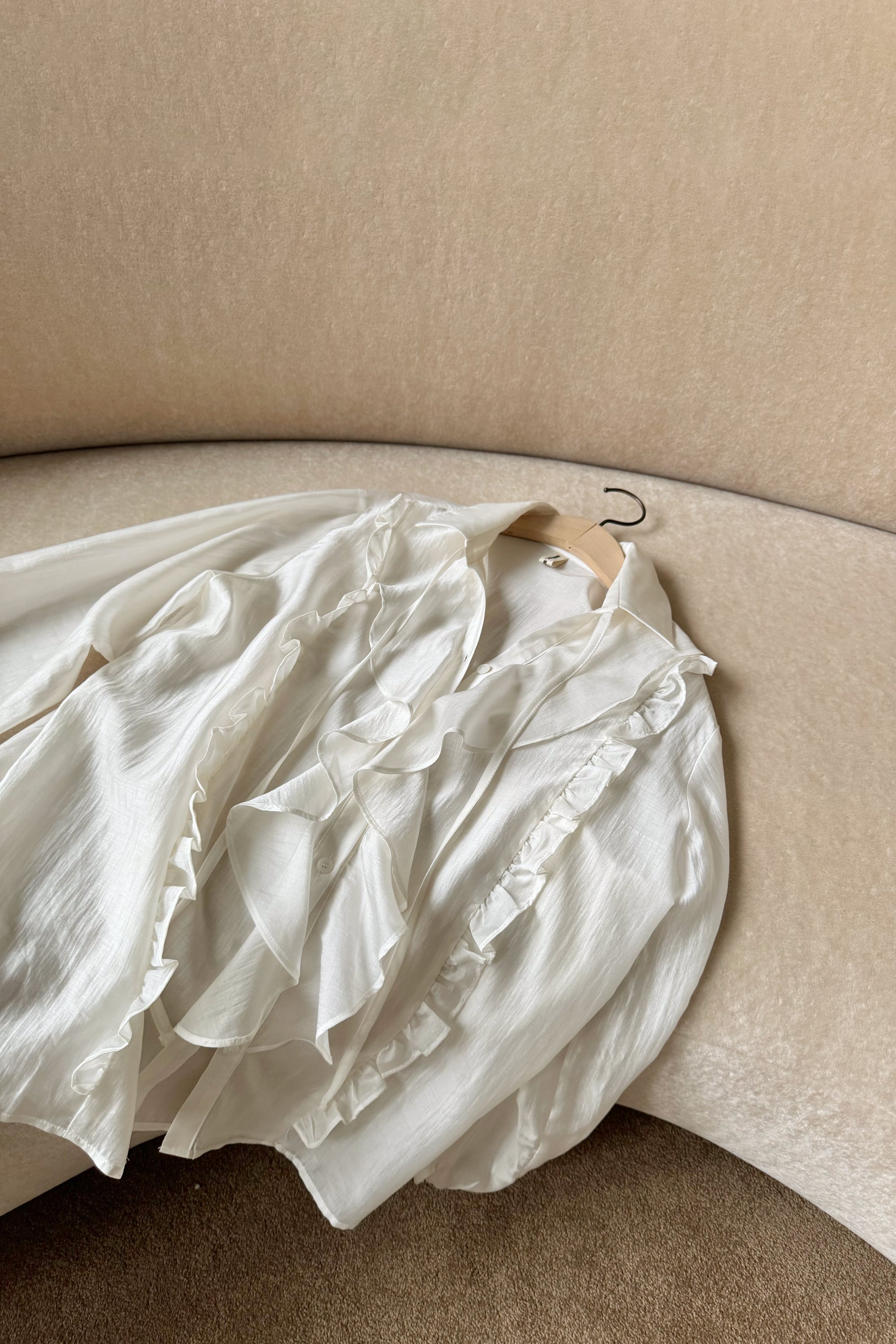 Lightweight fabric. Soft. Mildly sheer. Ruffles. Tie collar. Button up. Wide sleeves. Taper wrists with buttons.
