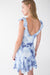 Lightweight chiffon. Ruffled trims. Short sleeves. Keyhole front with ties. Princess seams. Asymmetric hem. Lined interior. Hidden side zipper closure.