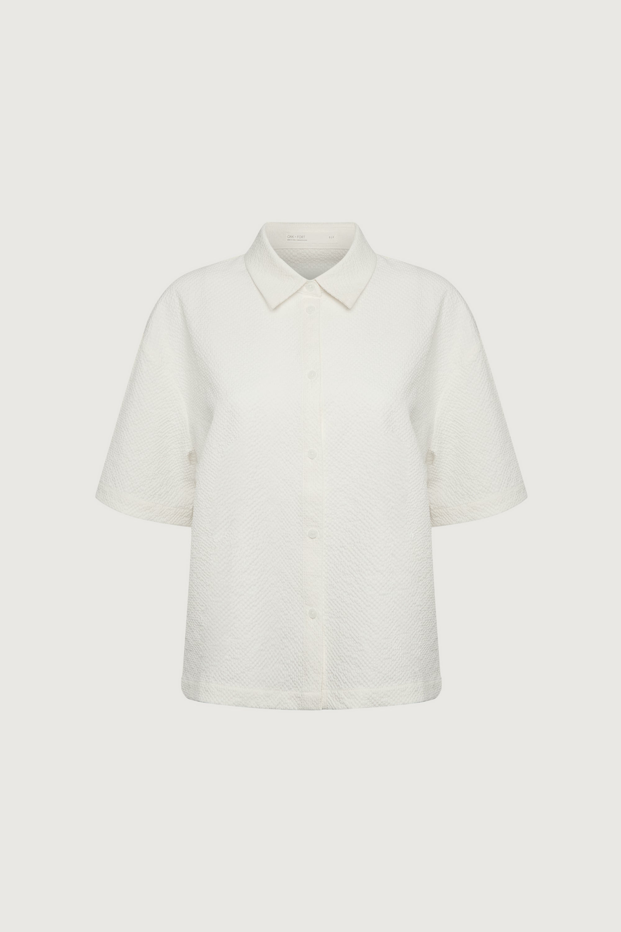 This short sleeve button up shirt is made from a lightweight seersucker in a relaxed, boxy fit. The perfect summer top with wear with matching shorts.