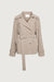 Double-breasted front. Belt with buckle at waist and sleeves. Notched lapels. Back vent and slit. Side pockets.