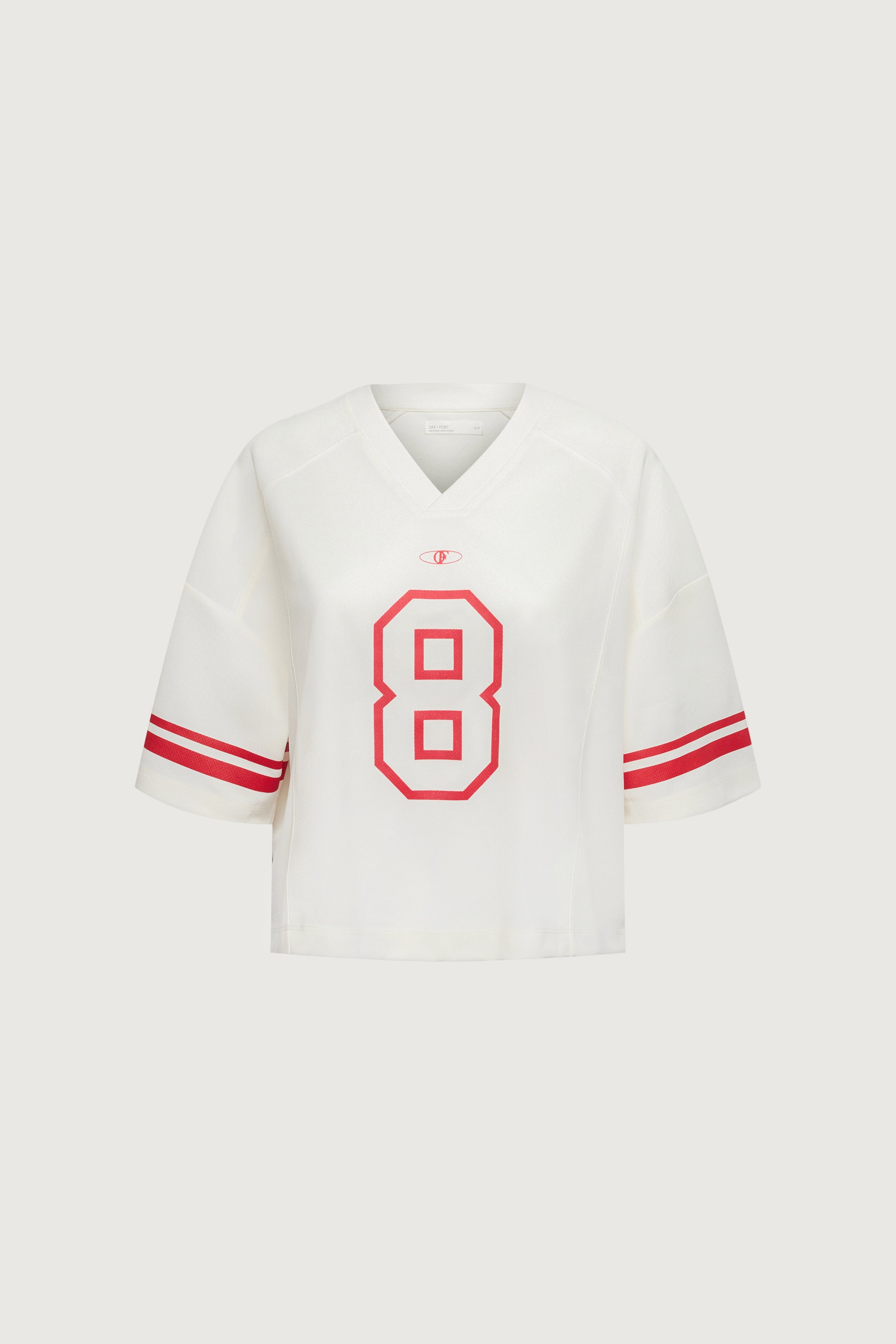 Birdseye mesh. V-neckline. Graphic print. Stripes on sleeve.