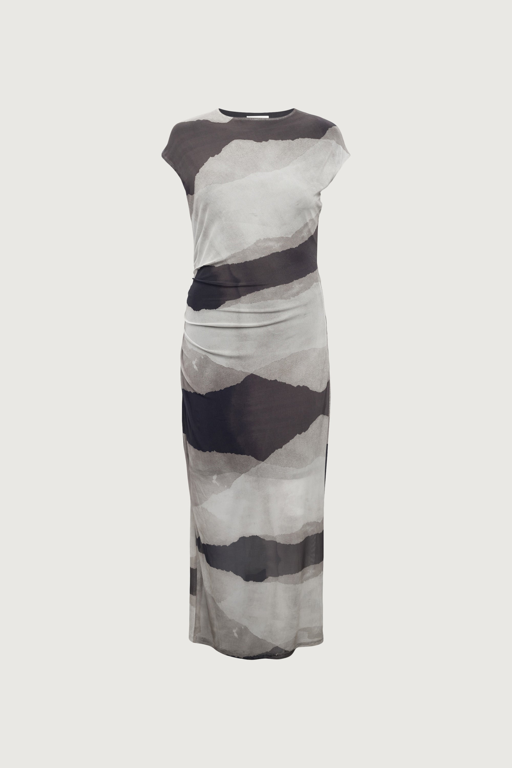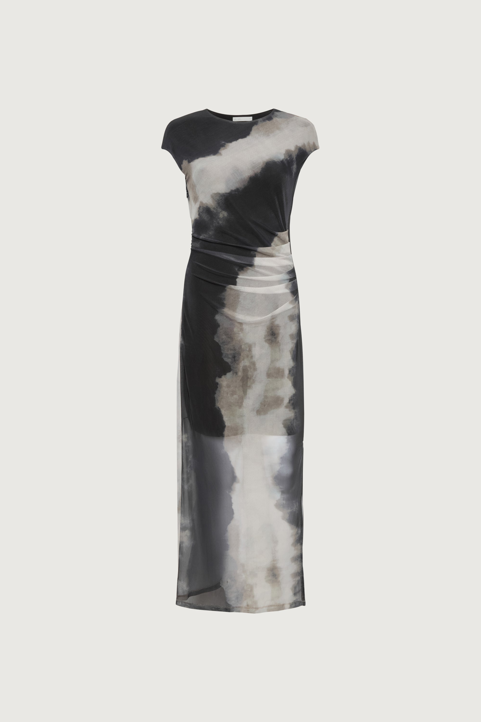 Sheer mesh fabric with lining. High neckline. Ruched detail. Front slit. Patterns may vary.