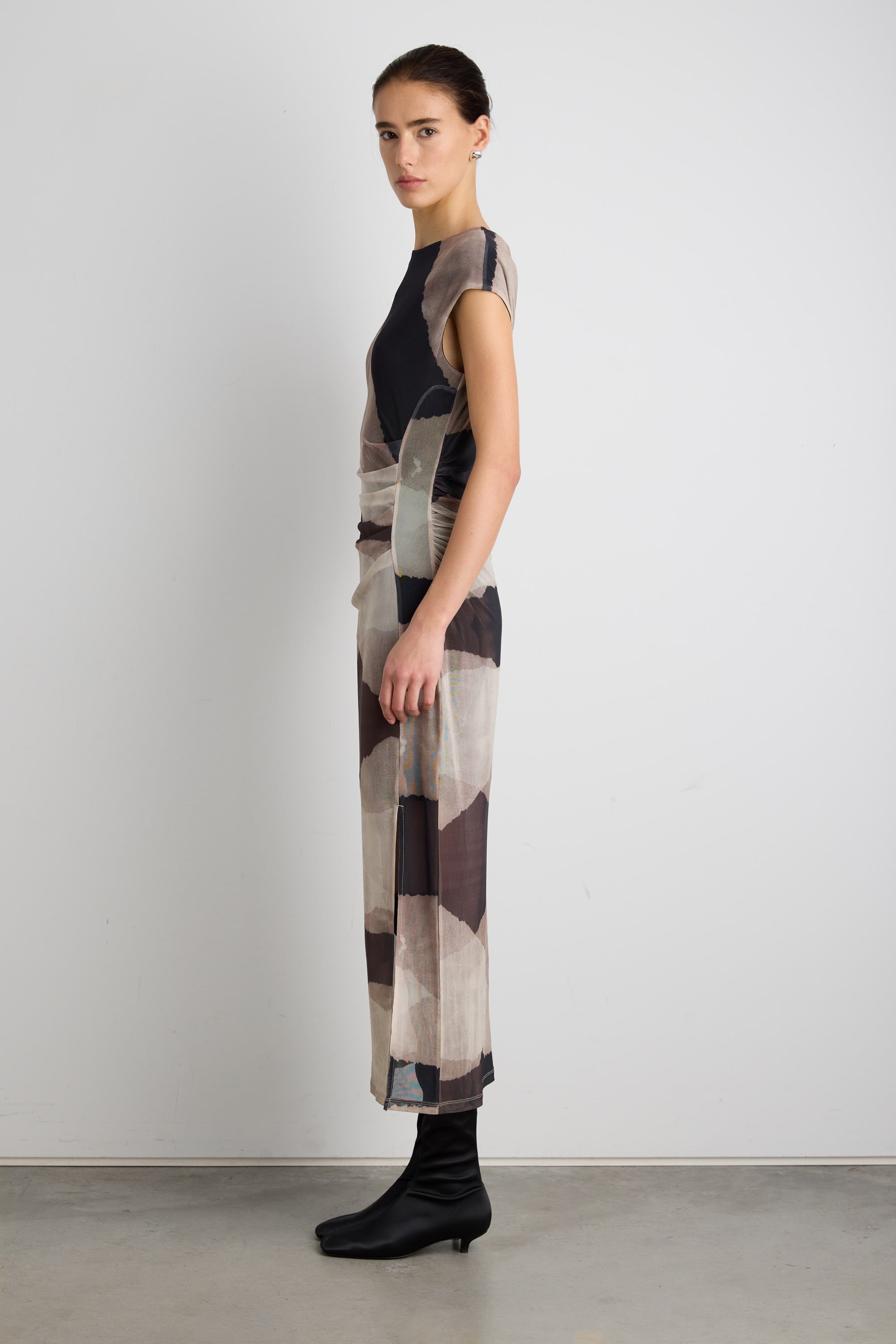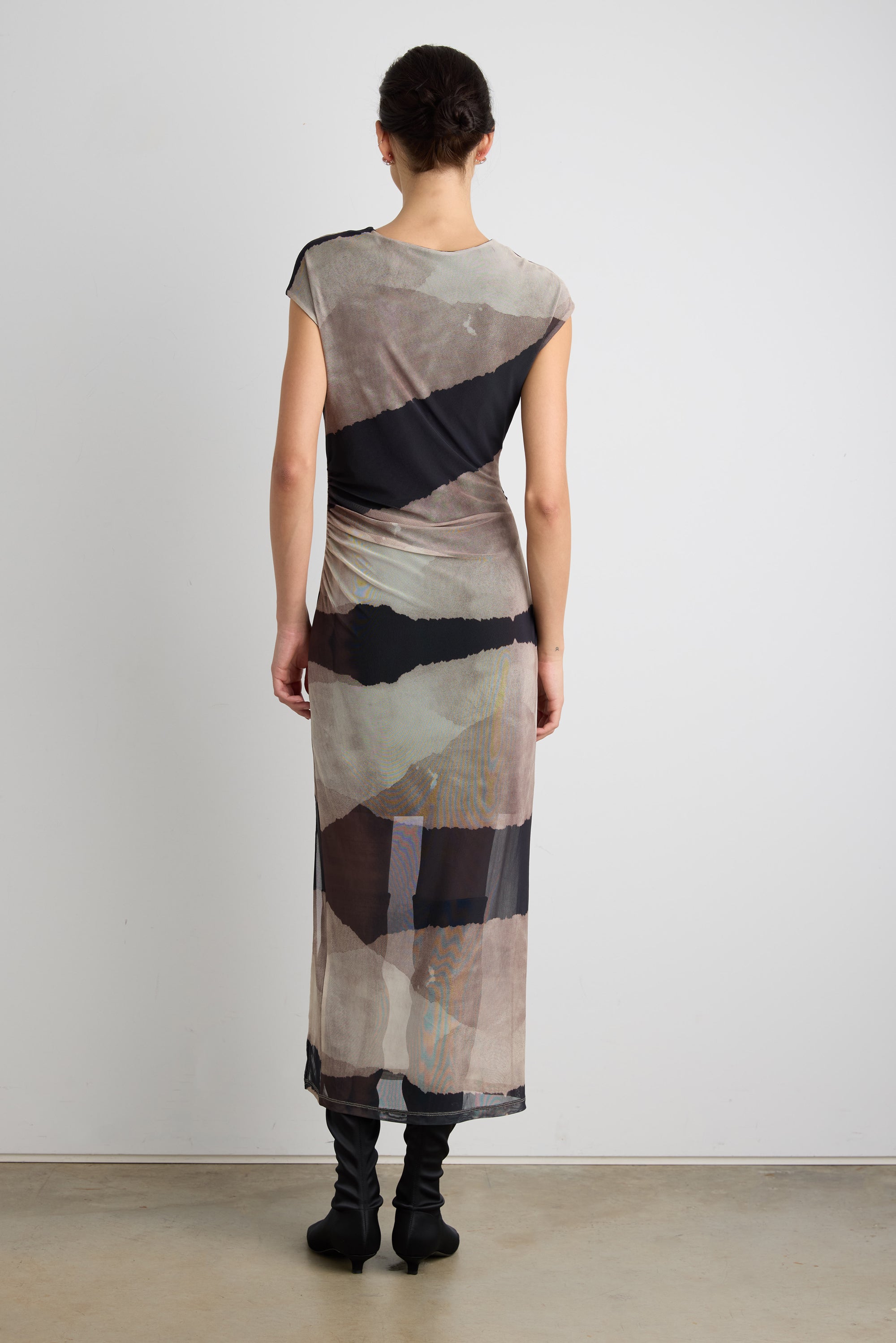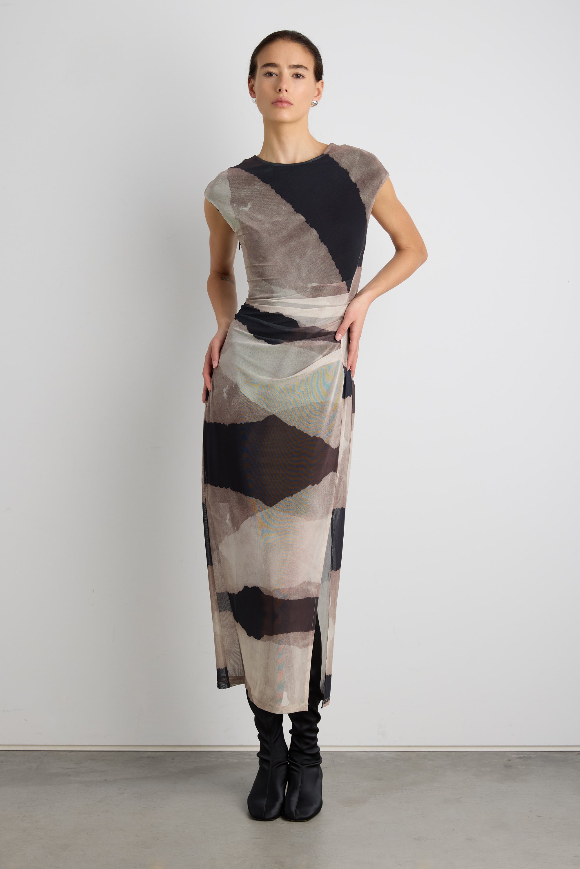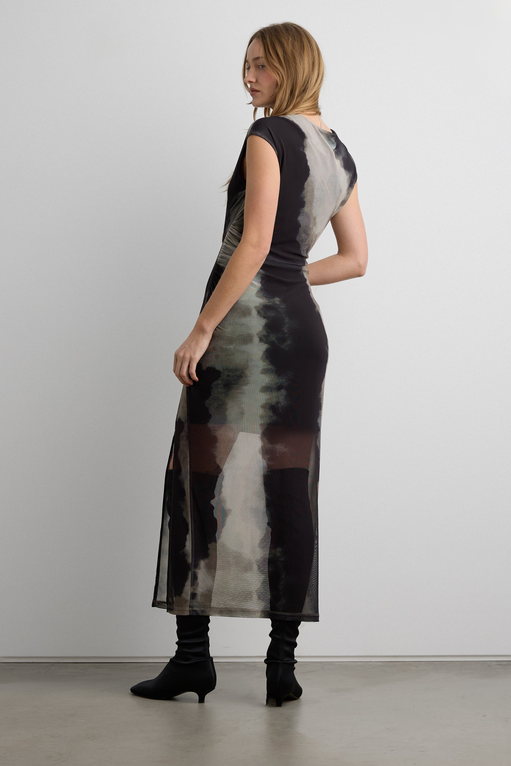 This sheer mesh patterned dress is made in a body-hugging silhouette and is lined half way to show off the legs. It's detailed with a high-neckline, a ruched side and a front slit. The perfect transitional dress you can wear with heels or knee high boots.