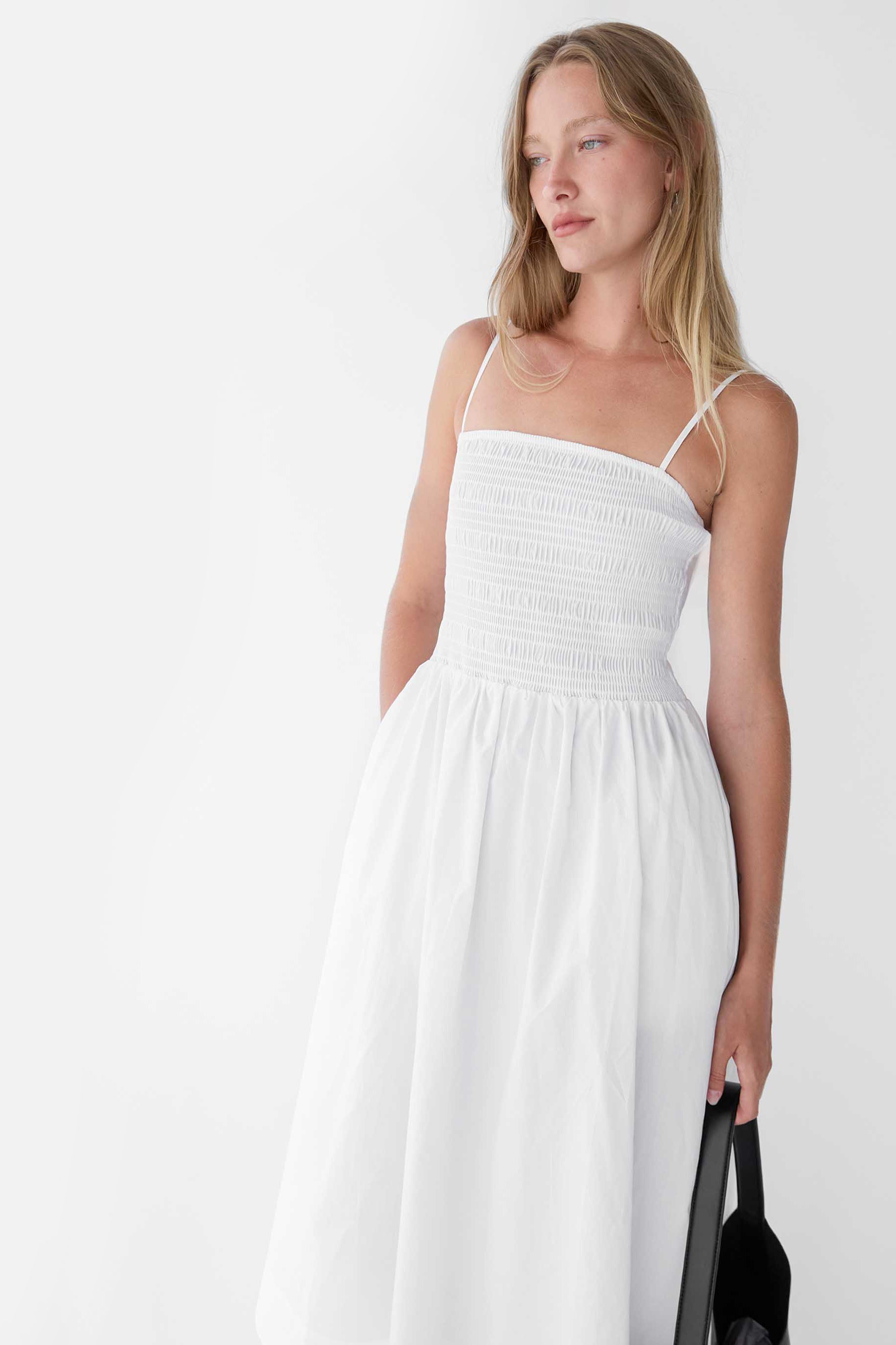 This smocked midi dress is cut from a lightweight airy cotton poplin in a relaxed fit. It has adjustable shoulder straps, side pockets and a gathered waist. The perfect summer dress to wear from day to night.