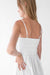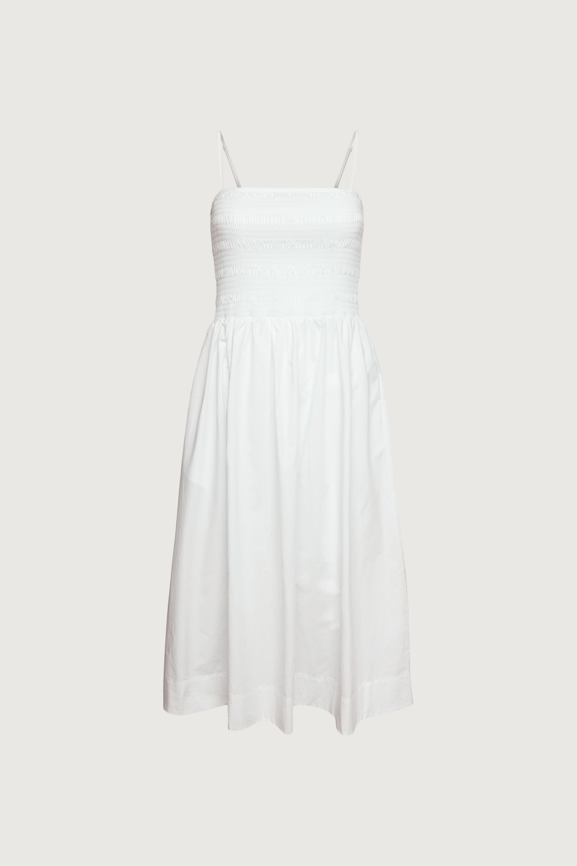 Lightweight cotton poplin. Smocked square neck bodice. Adjustable shoulder straps. Gathered waist. Side pockets.