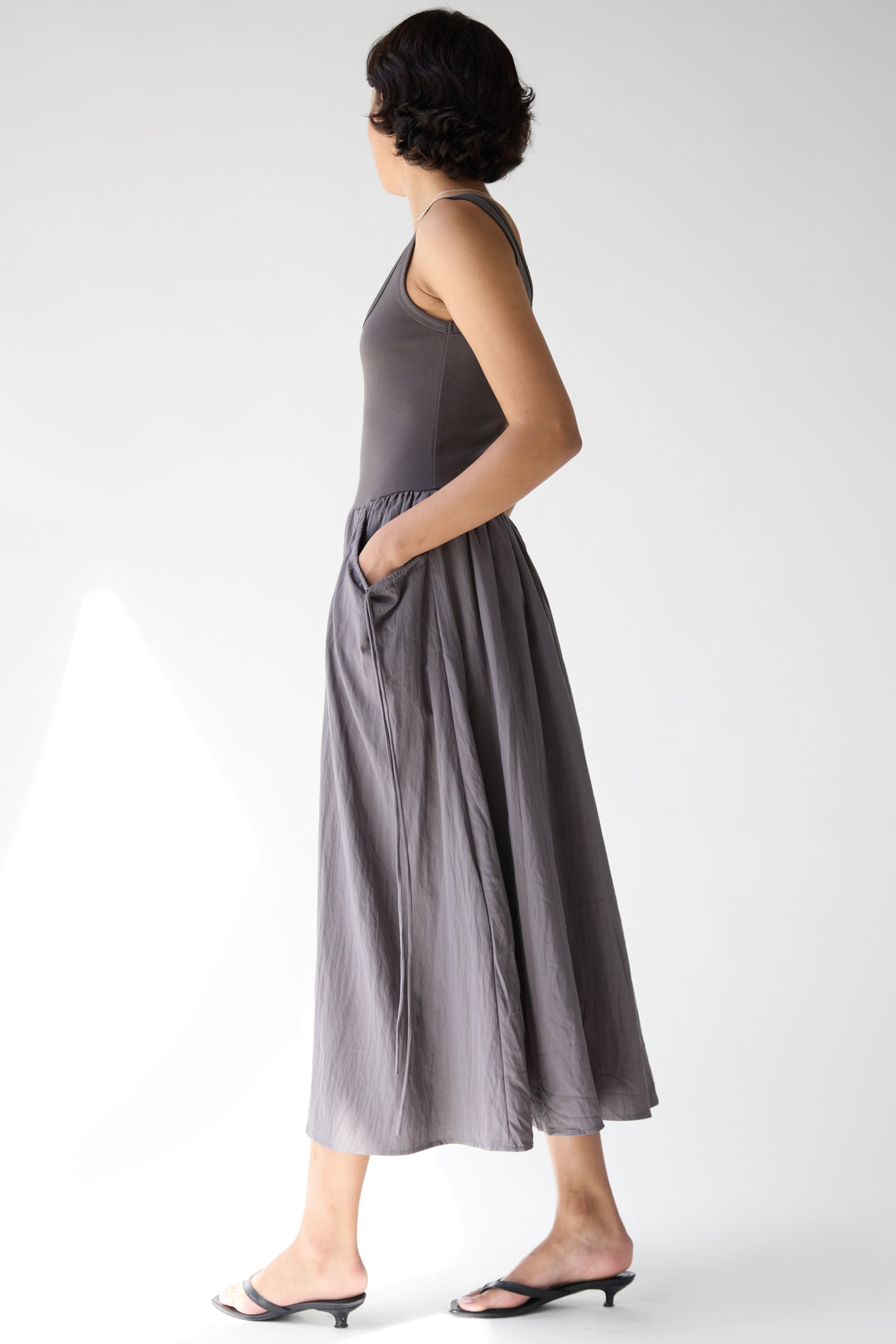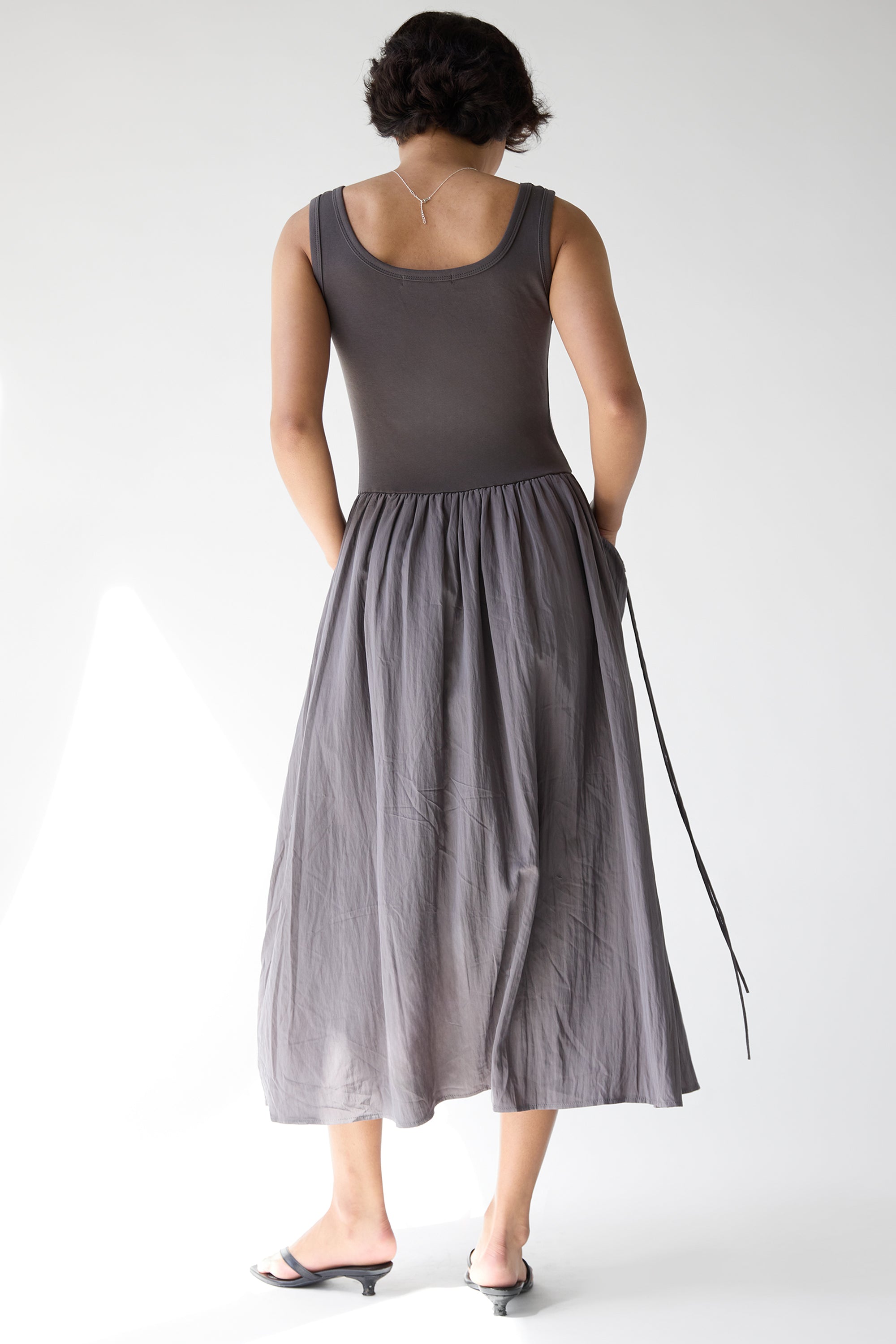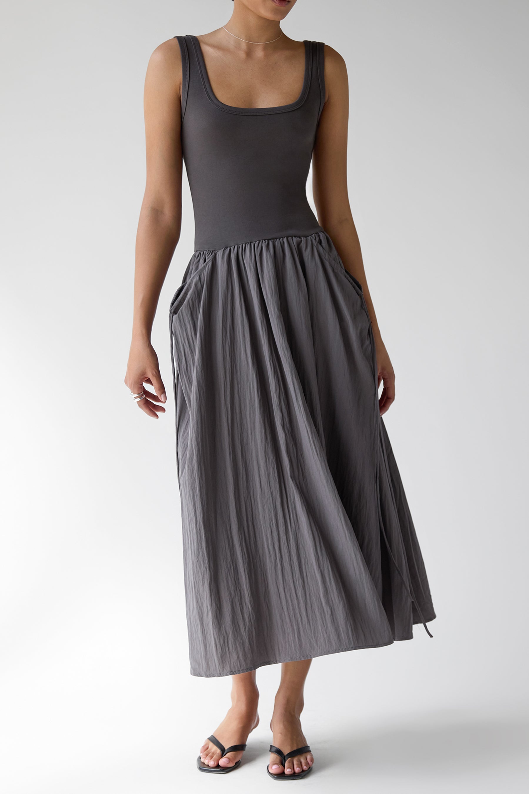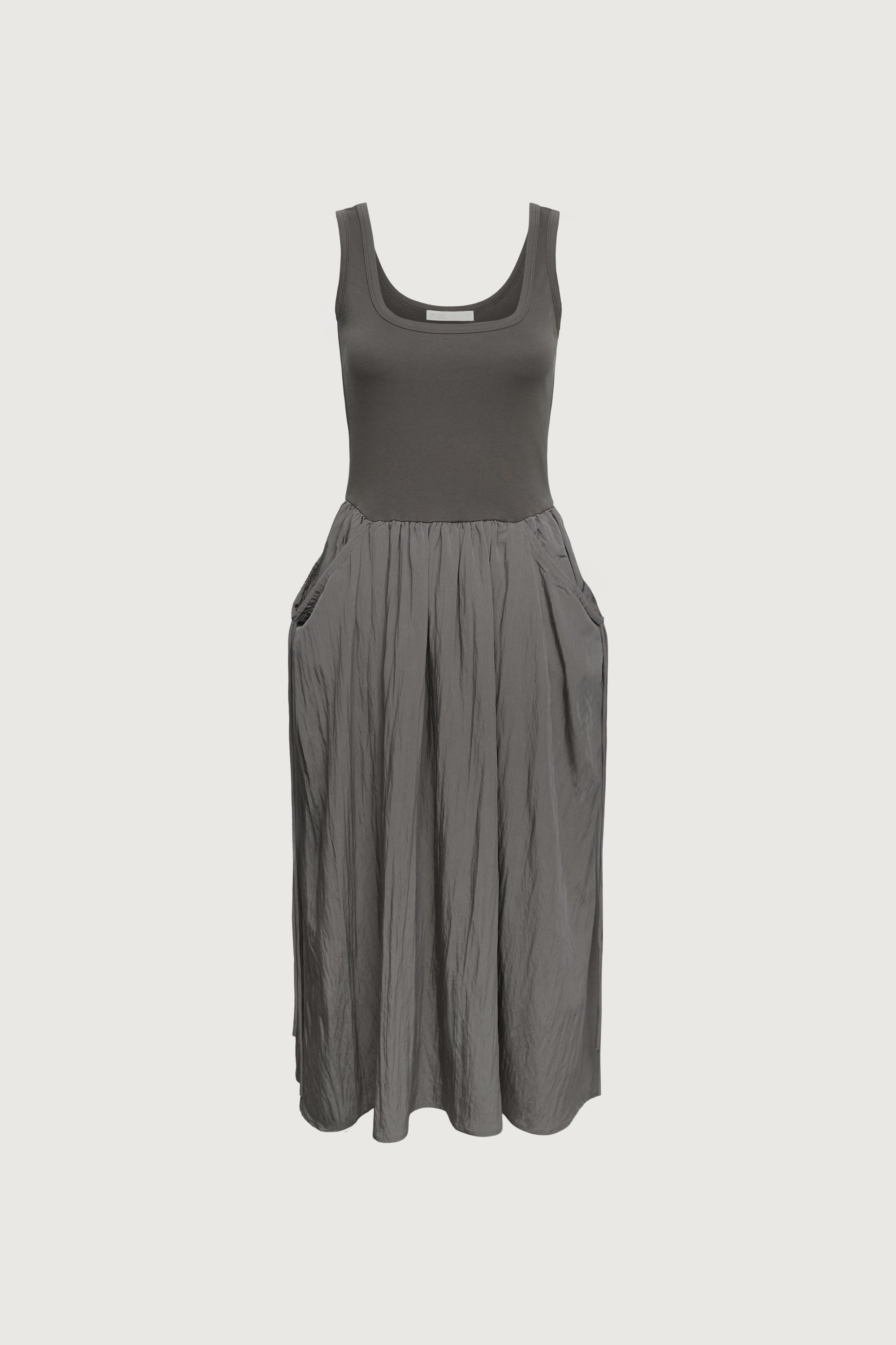 This maxi dress features a flattering scoop neckline, a gathered waist, and functional pockets with string detailing. The top of the dress offers ample stretch, ensuring all-day comfort and ease of movement. Designed for both style and versatility, it's perfect for everyday wear.