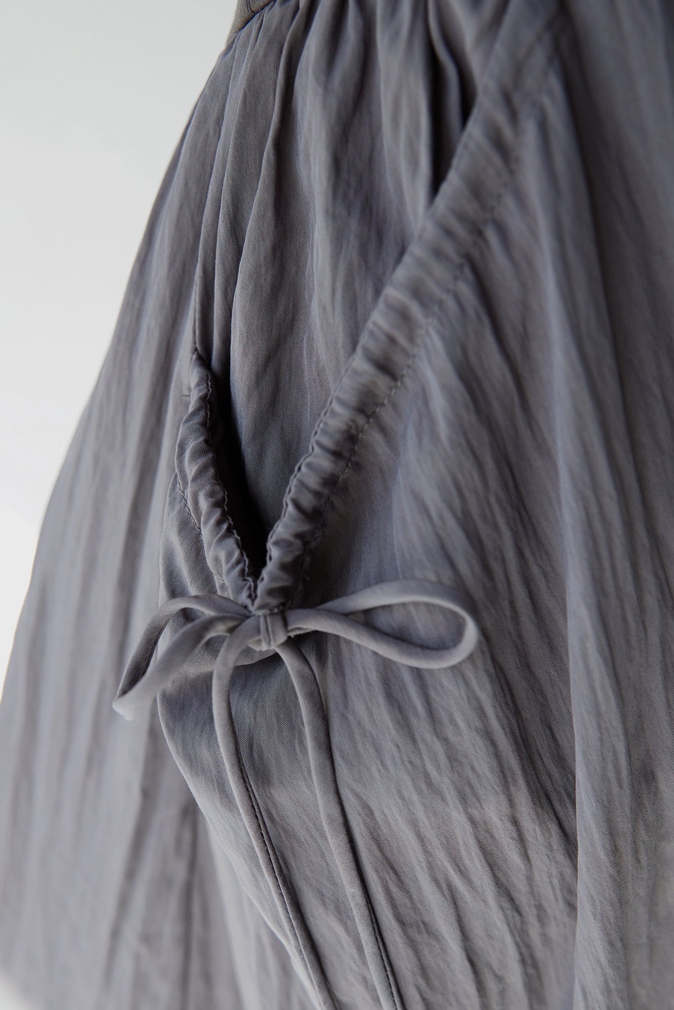 Scoop neckline. Gathered waist. Pockets. Stretch fabric.