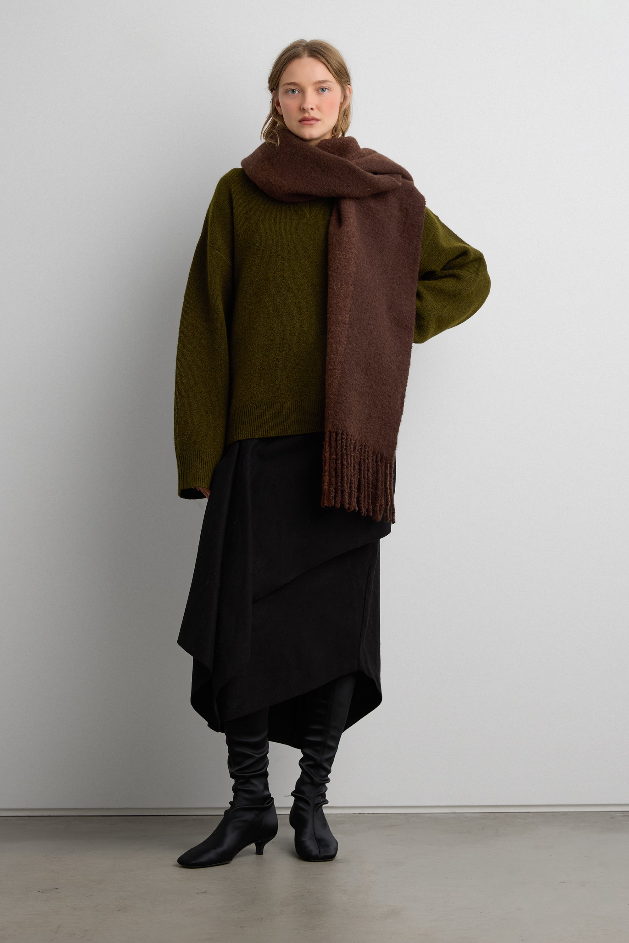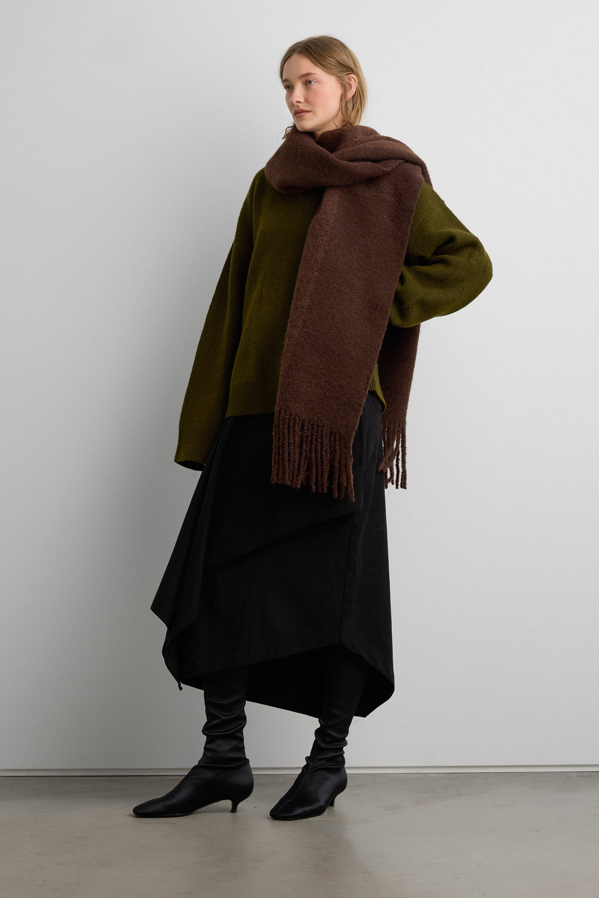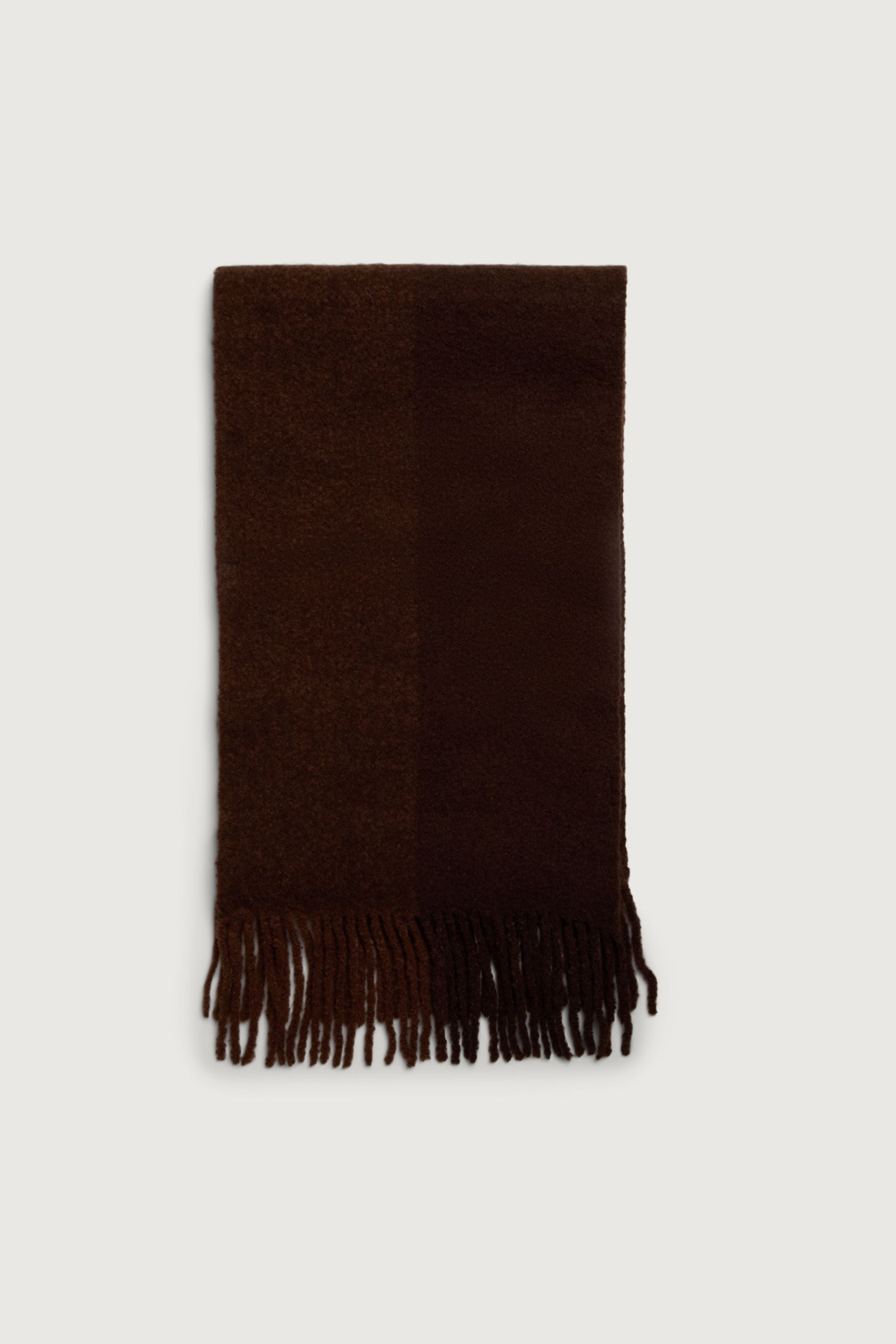 A textured striped scarf with tassel detailing, crafted from soft boucle knit for a cozy, dimensional feel. Designed with generous proportions and subtle contrast stripes, it drapes effortlessly while adding warmth and visual interest to any look.