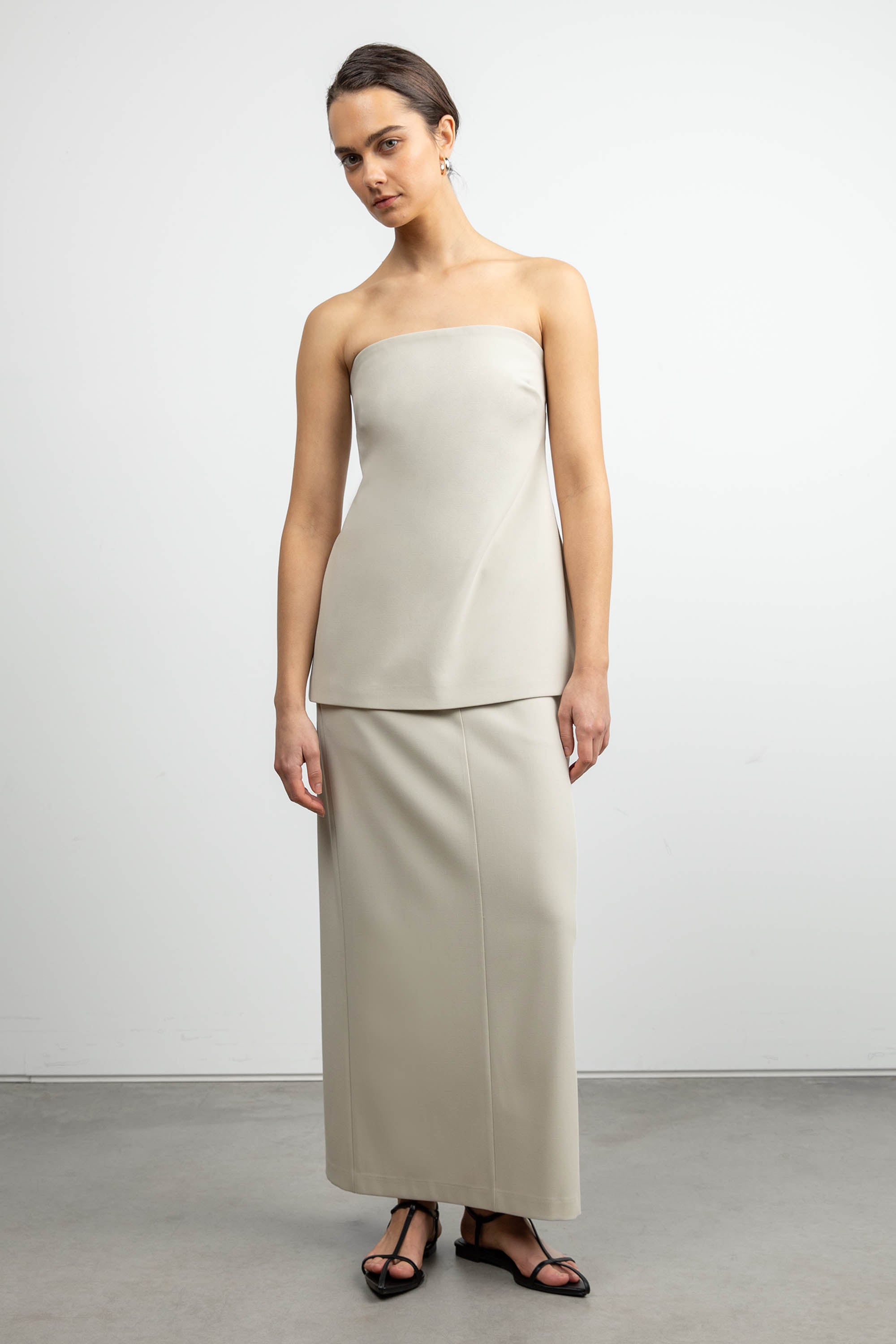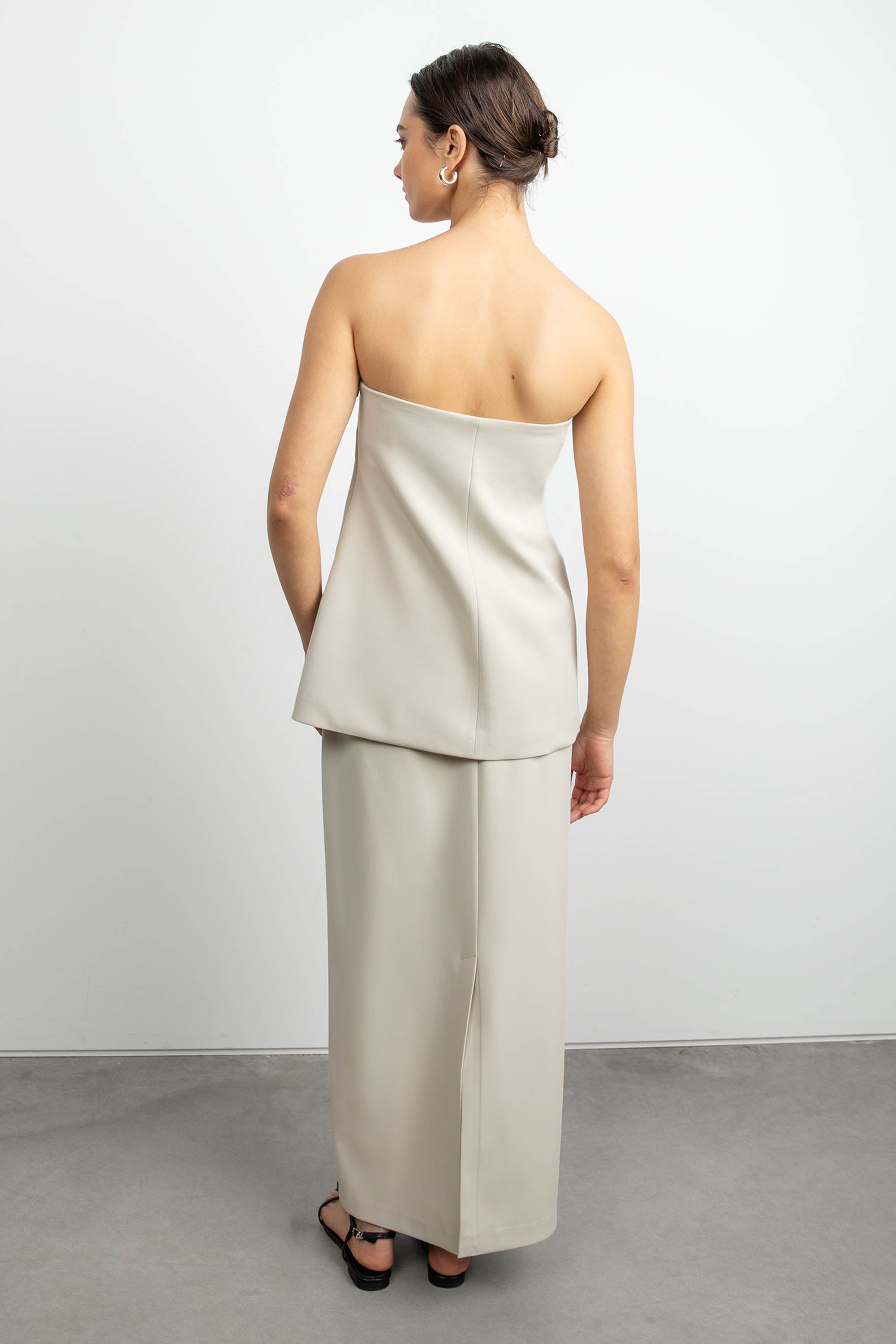 This suiting tube top is cut from recycled materials that is GRS certified —a climate-friendly approach to production which reduces the harmful impact on environment. It's made in a relaxed fit and has a side zipper closure. A versatile choice you can wear as a set with the Maxi Suiting Skirt (SK-11843-W) or suiting trousers.