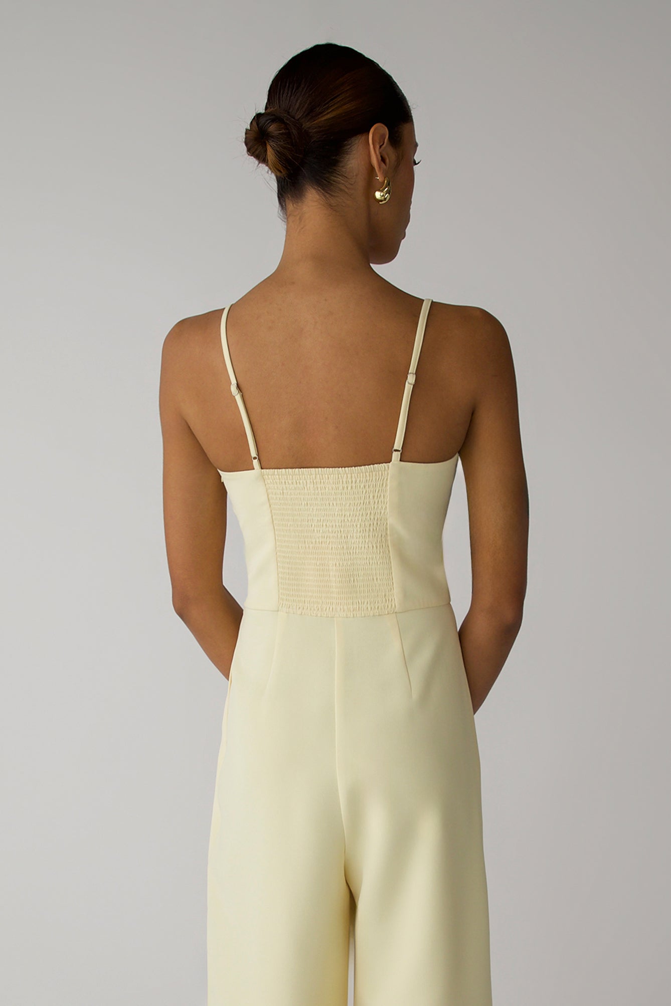 This sweetheart neckline jumpsuit is made from suiting fabric in a classic fit. It's designed with a smocked back, adjustable straps, side pockets and a straight, wide leg cut that is fitted at the hips. Wear yours with strappy heels and statement earrings.