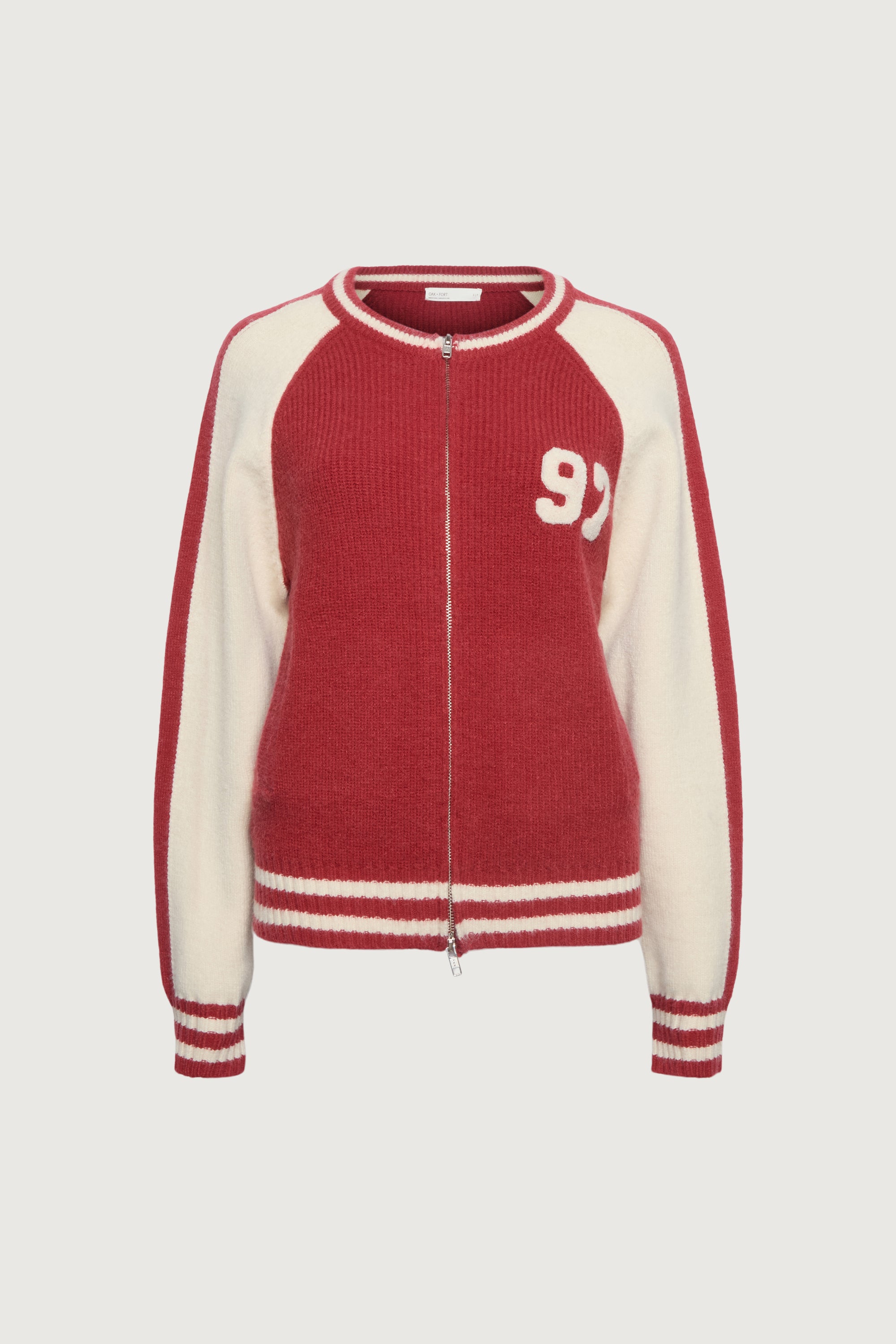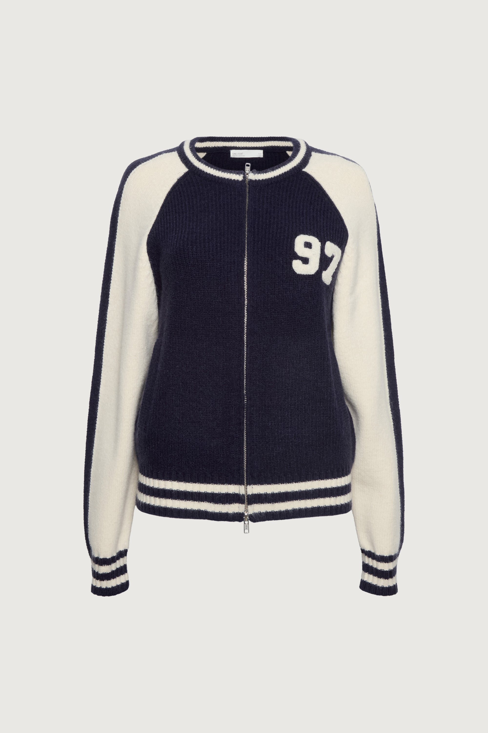 Chunky knit. Side pockets. Raglan contrast sleeves. Zip front. Embroidered 97 patch. Striped ribbed trims.