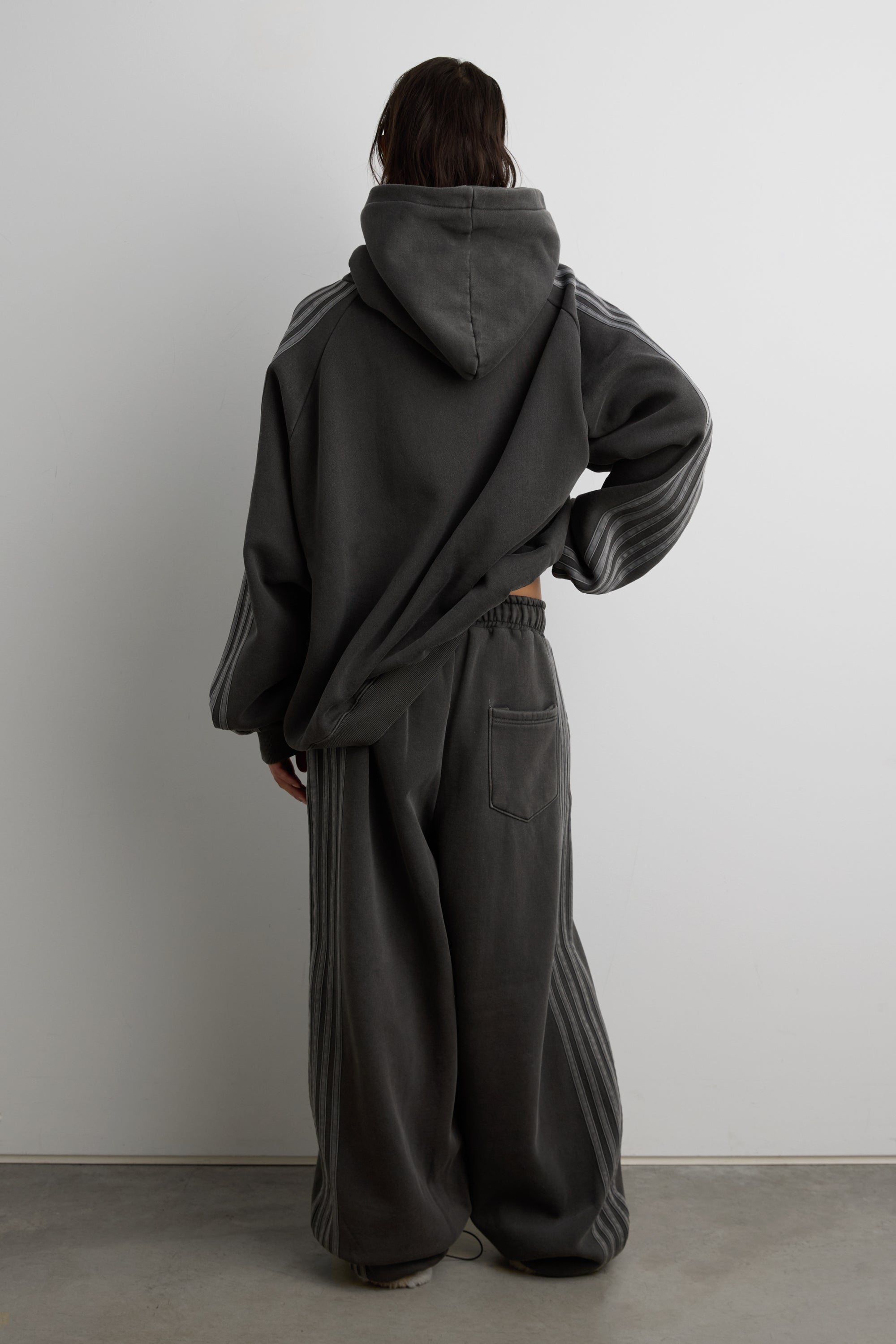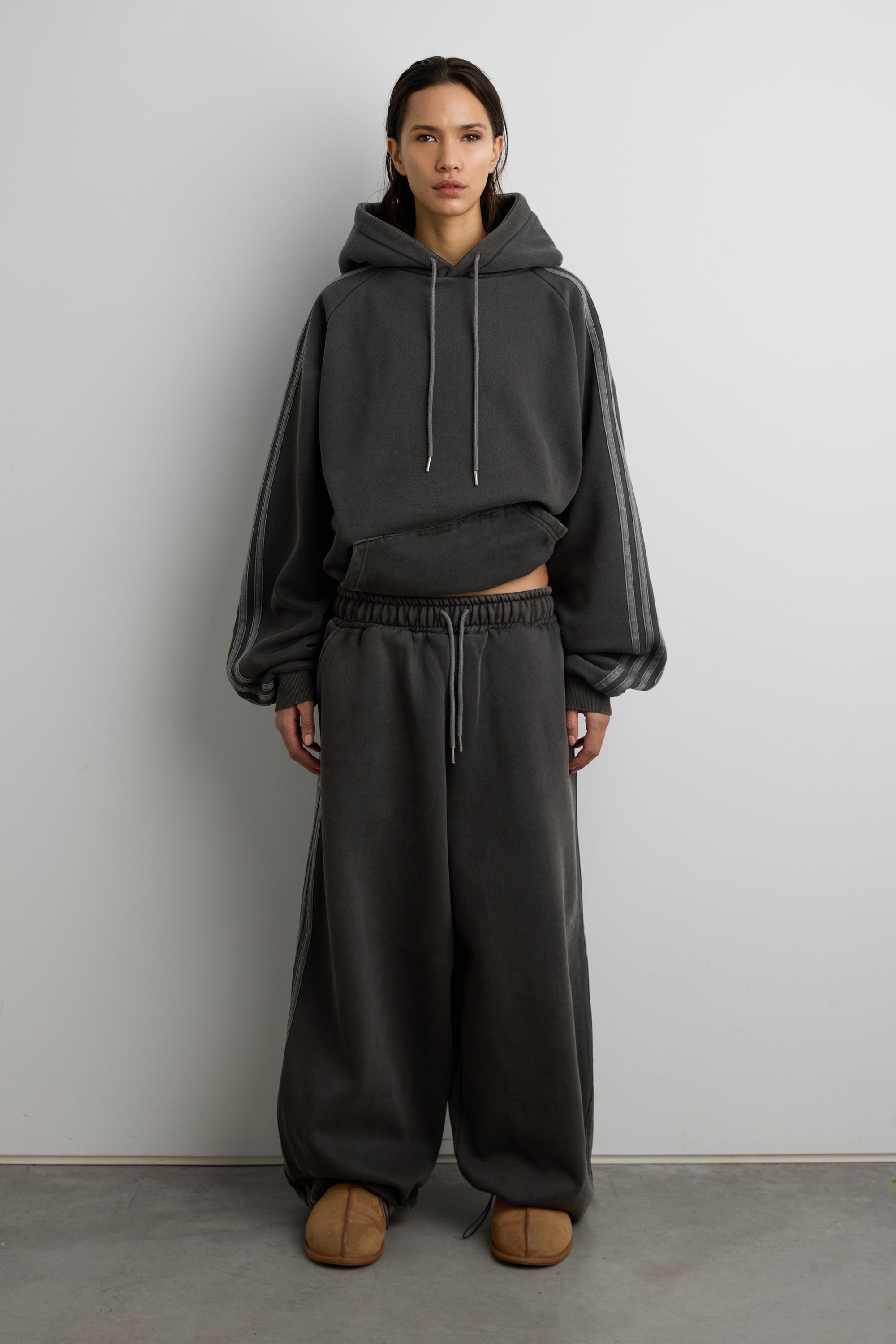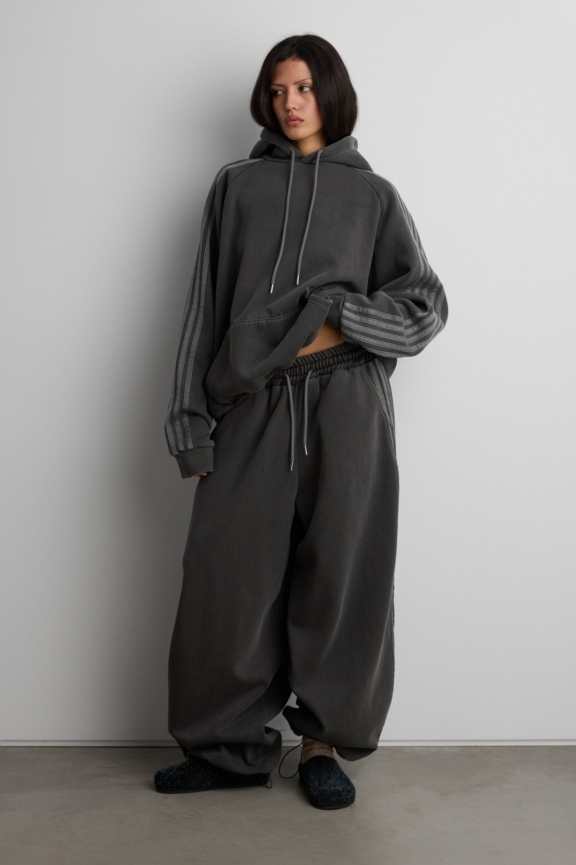 These fleece studio boyfriend track wide-leg sweatpants are crafted from a heavyweight cotton blend and has a unique, lived-in vintage wash. It's made in a baggy oversized fit and is detailed with an elasticated drawstring waist, side pockets, side stripes down each leg and a shockcord at the hem to create a jogger silhouette. It's lined with fleece to keep you cozy no matter what season. Wear yours as a set with the matching hoodie.