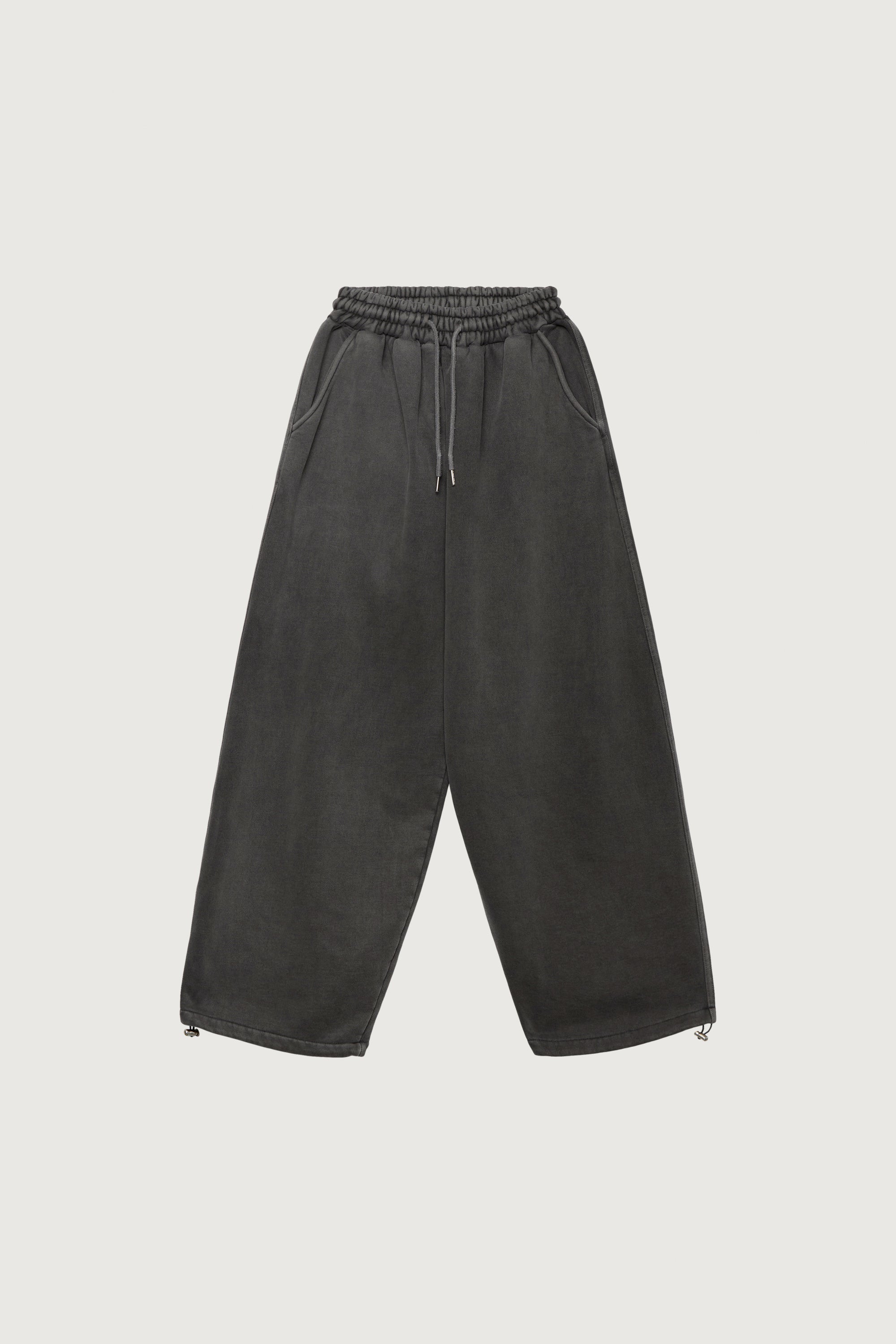 Vintage wash. Heavy weight cotton blend. Elastic drawstring waistband. Shockcord hem. Side and back pockets.