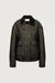 Wool-blend herringbone. Vegan leather collar. Quilted interior. Zipper front. Front patch pocket with snap buttons. Elasticated hem.