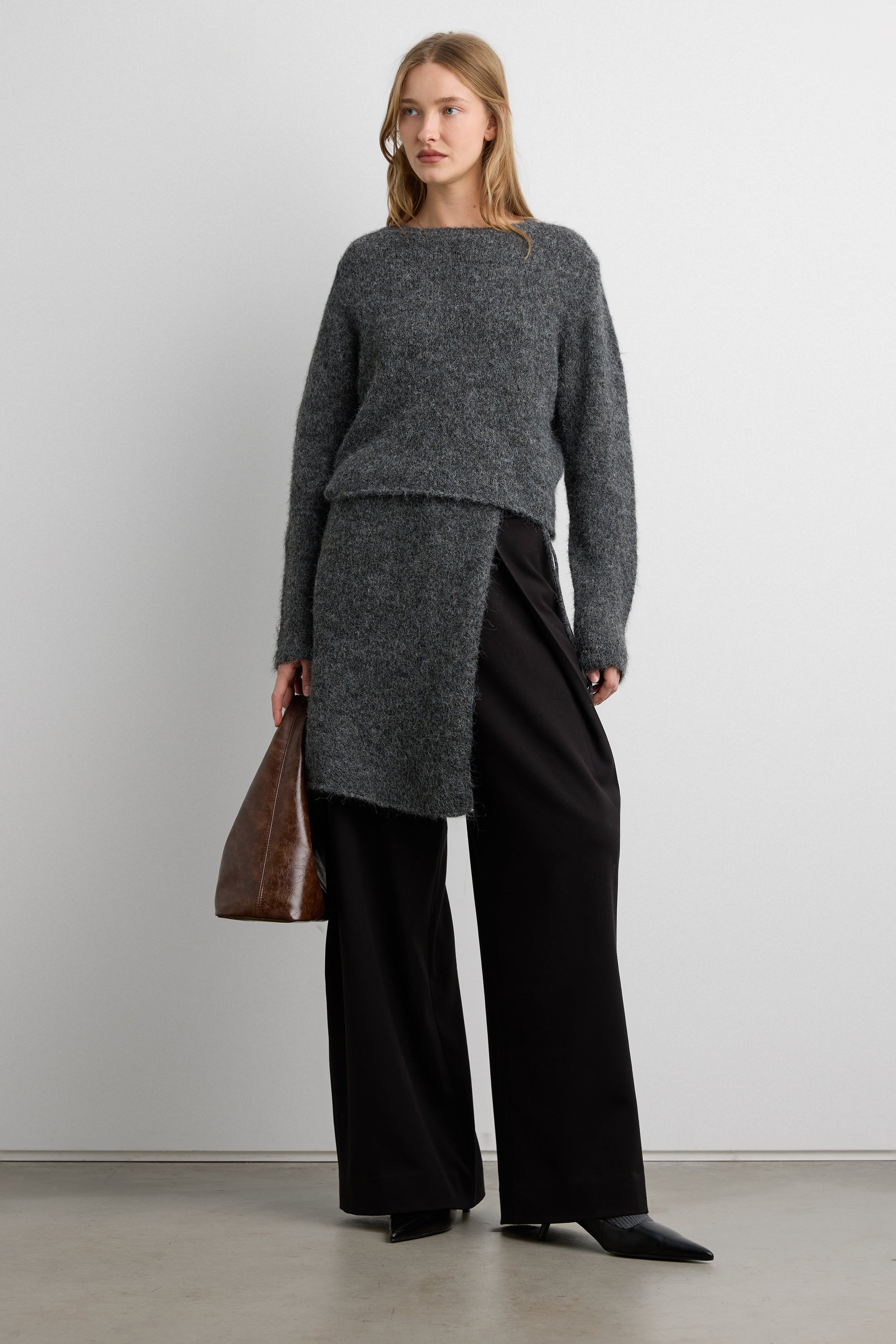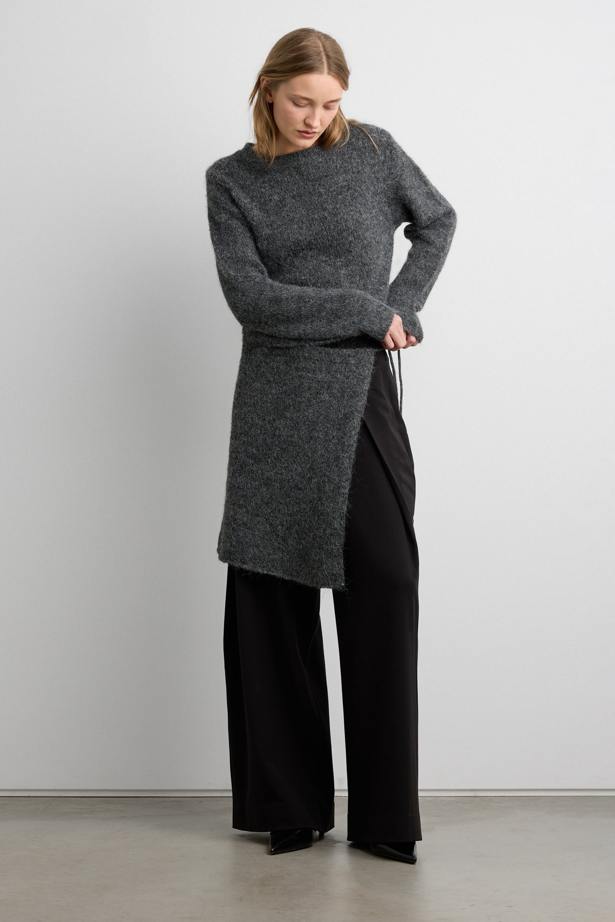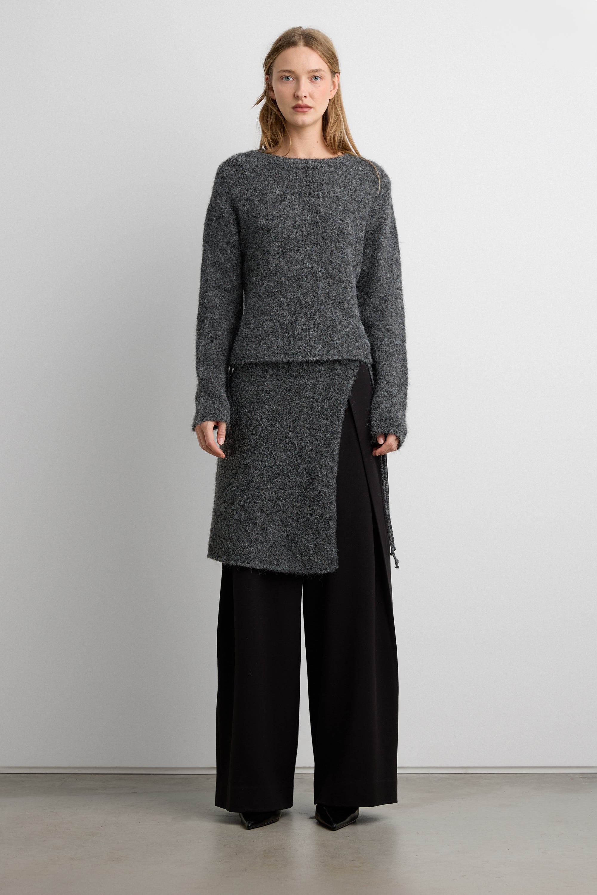 A cozy knit set featuring a relaxed crewneck sweater and a coordinating wrap skirt with a side tie detail. Designed for comfort and ease, the textured knit is blended with touches of wool to offer a cozy yet elevated feel. Wear together for a refined monochrome look or mix and match with seasonal staples.