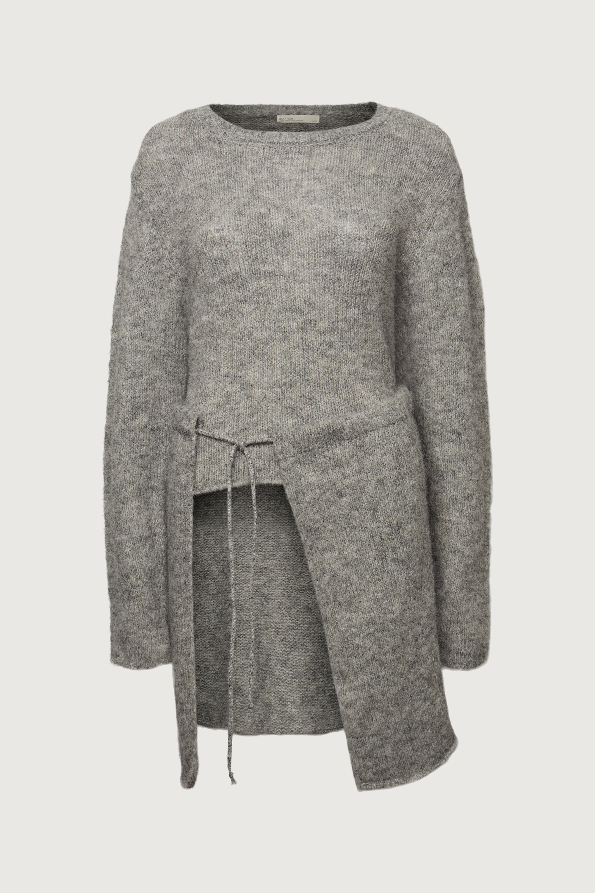 Crew neckline. Ribbed trims. Dropped shoulders. Wrap skirt with adjustable side tie closure.