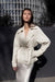 Side wrap. Adjustable D-ring. Side zipper. Back welt pockets. Elastic waistband at the back.